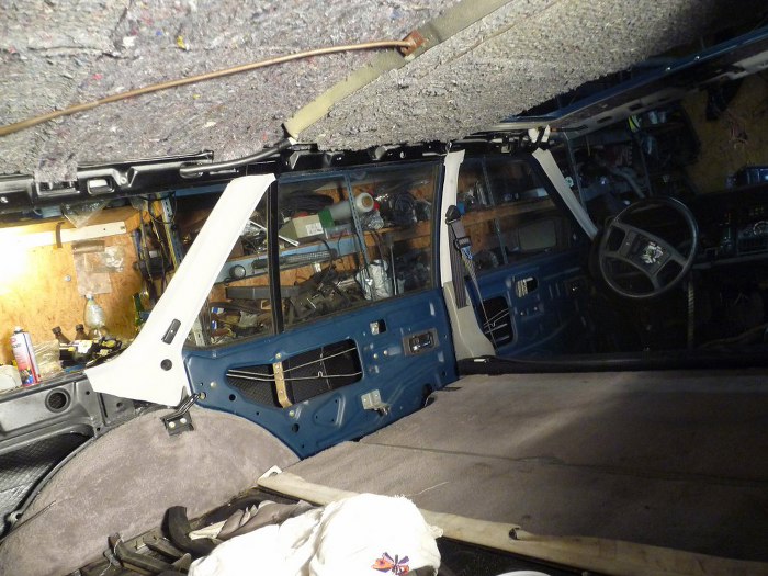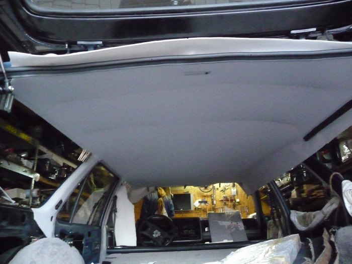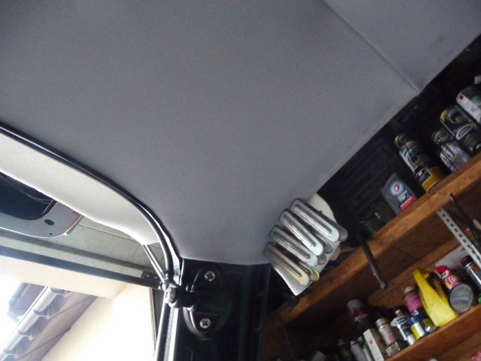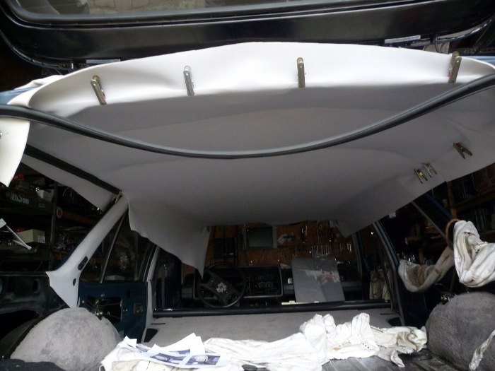 Następnie włożyłem na miejsce podsufitkę i wstępnie ją ułożyłem na rantach szyb. Nie da się założyć szyb przed podsufitką... Samo wkładanie podsufitki było o tyle trudne, że trzymają ją pręty tylko w tylnej części auta, przód wisi luźno, bo jest tam kaseta szyberdachu. Było to bardzo trudno równo ułożyć i naciągnąć. Na zdjęciu widać specjalistyczne narzędzia, których używałem do podtrzymywania materiału. W miejscu lewej tylnej szyby widać, że używałem kawałka uszczelki gumowej jako elementu dociskającego podsufitkę do rantu szyby podczas klejenia. Po przyklejeniu dopiero odcinałem nadmiar materiału. Operacja z podsufitką to okolice marca 2014r.