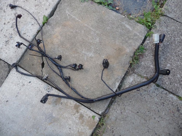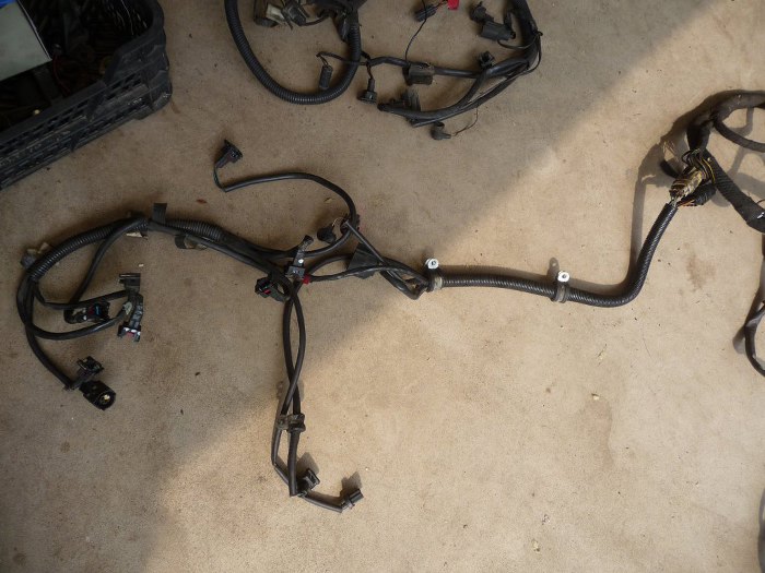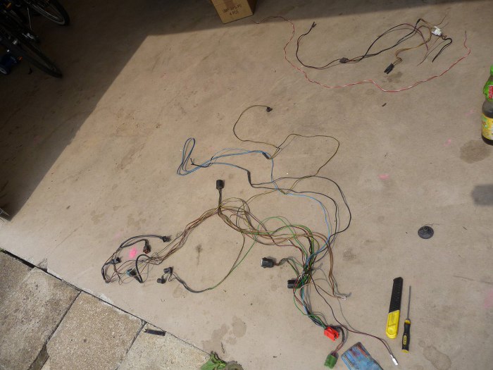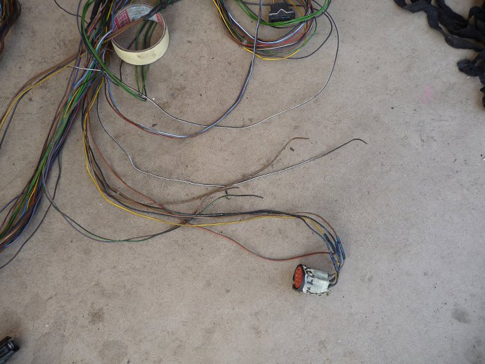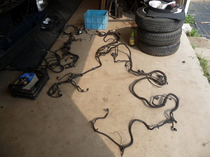 Na początek wziąłem oryginalną wiązkę silnikową od Granady i wyjąłem z niej wszystko sterujące silnikiem (zapłon i sterowanie wtryskiem mechanicznym) - to jest ta część przewodów pośrodku zdjęcia. Zostaną z niej tylko te kilka przewodów z górnej części zdjęcia - czujnik poziomu płynu hamulcowego, + po zapłonie i sterowanie rozrusznika.