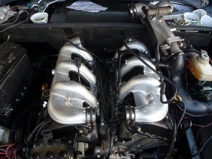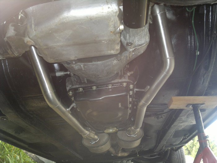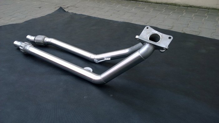 Tu widać już rury wyspawane do końca i z wstawionami łącznikami elastycznymi. Rury będą na sztywno zamocowane do kolektorów wydechowych, a za pomocą widocznych elementów mocujących do śrub w skrzyni biegów. Łączniki elastyczne są potrzebne, bo cała reszta wydechu jest mocowana do nadwozia.