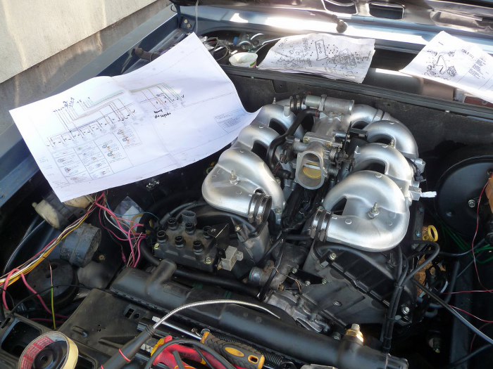 Po ułożeniu wiązki i ogarnięciu podciśnień mogłem zacząć składać układ dolotowy. Po lewej widać schemat wiązki silnikowej. Wszystko sprawdzałem po kilka razy...