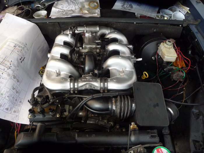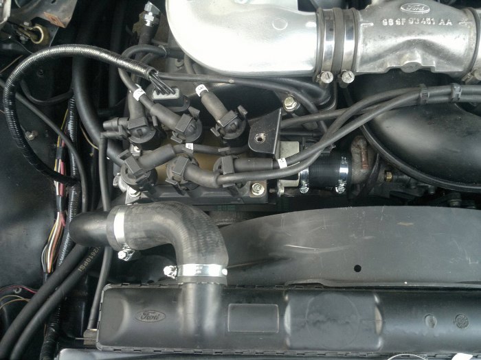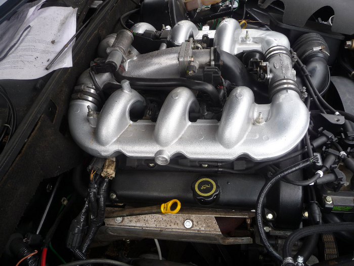 Widok z boku pokazuje jak to wszystko do siebie ładnie pasuje. Widać też mocowanie pod jedną ze śrub cewek. Cienka rurka to podciśnienie z silnika, wykorzystałem fabryczne elementy z układu podciśnienia ze Scorpio, któe dostałem razem z silnikiem.
