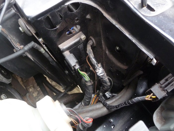 Widok z prawej strony. Odpięcie dwóch wtyczek (lewa strona zdjęcia) wiązki silnika i jednej od cewek (prawa strona zdjęcia) uwalnia nam silnik do ew. jego wyjęcia.