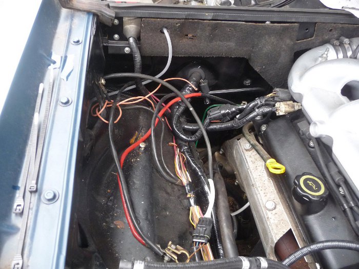 Okolice półki akumulatora (jeszcze nie zamontowanej. Tu dużo się dzieje, bo fabryczna wiązka przedniej części auta (lampy, kierunkowskazy itp.) tędy idzie (jeszcze nie zaizolowałem jej, bo grzebię w przewodach przenosząc np. zbiorniczek wyrównawczy i jego czujnik poziomu), do tego doszła cała wiązka od wtrysku. Widać też na ścianie grodziowej gdzie ją puściłem do wnętrza auta, tam będzie umieszczony komputer.