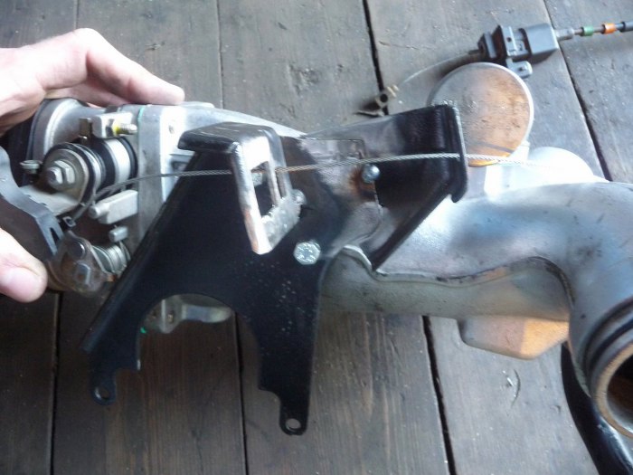 Przy okazji składania układu dolotowego zmodyfikowałem też mocowanie linki gazu. Linka musi być od silnika BOA, z czujnikiem kick down. To wymagało nieco przeróbek. Widoczne na zdjęciu dodatkowe mocowanie, tu w fazie pierwszego spawu, to mocowanie linki tempomatu, który kiedyś planuję tu zamontować.