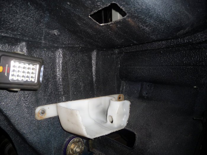 Na zbiorniczek płynu do spryskiwaczy stwierdziłem, że nie znajdę miejsca w komorze silnika. Postanowiłem go przenieść pod błotnik prawy. Jest tu tak mało miejsca, że musiałem kupić w sumie dwa zbiorniczki - jeden pociąłem i wykorzystałem jako szablon do wyznaczenia punktów mocowania i przejścia przez blachę do komory silnika. Otwory wywiercone w karoserii dostały nitonakrętki dla ułatwienia montażu.