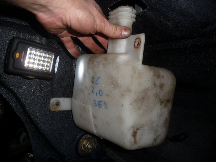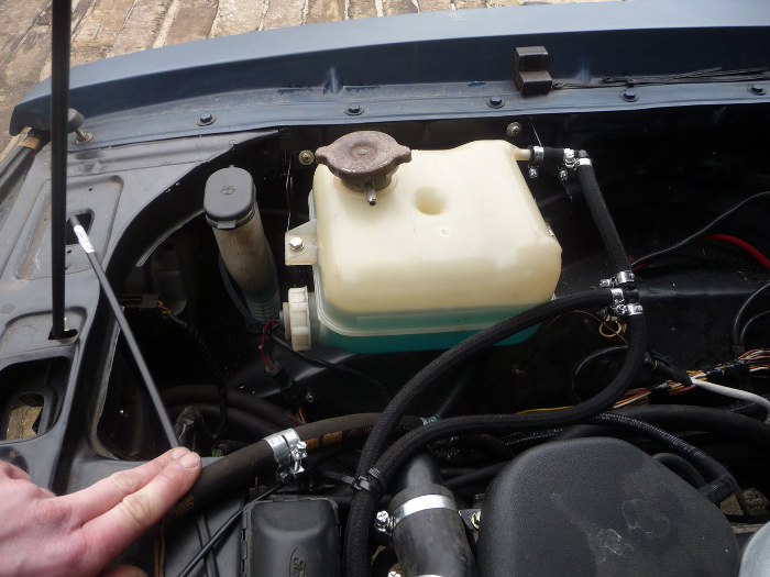 W komorze silnika widać gdzie się wlewa płyn do spryskiwaczy. W tymi miejscu zmieściłęm też zbiorniczek wyrównawczy. Fabrycznie w Granadzie z wtryskiem mechanicznym był inny, mocowany między akumulatorem a silnikem, ale teraz w jego miejscu jest wlew oleju w nowym silniku. Brakuje niestety centymetra, żeby to pasowało... Korcił mnie zbiorniczek wyrównawczy od Granady z dieslem, który jest w okolicach serwa hamulcowego, ale nie znalazłem niepopękanego i z czujnikiem poziomu. Dlatego w końcu użyłem zbiorniczka z Granady gaźnikowej, razem z mocowaniami. Tyle, że oryginalnie ten zbiorniczek jest po lewej stronie auta... Mocowania musiałem powyginać na drugą stronę, ale w dużej części są nienaruszone :) Musiałem też przedłużyć przewody do czujnika poziomu. Do zbiorniczka doprowadziłem odpowietrzenie chłodnicy i bloku silnika, chociaż niewykluczone, że jeszcze tu coś zmienię. Po tej stronie komory silnikowej, między zbiorniczkiem wyrównawczym a akumulatorem muszę jeszcze zmieścić zbiorniczek na płyn do wspomagania... Aha, korek od zbiorniczka wyrównawczego oczywiście zmienię :)