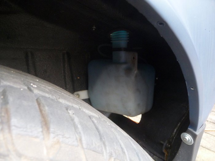 A tu już docelowy zbiorniczek, nawet z płynem. Oczywiście dopełnieniem tej przeróbki było doprowadzenie tu przewodów zasilających pompkę spryskiwacza i do czujnika poziomu. Całość będzie w przyszłości zasłonięta plastikowym nadkolem, na które mocowania są już przewidziane - to te otwory w rancie błotnika