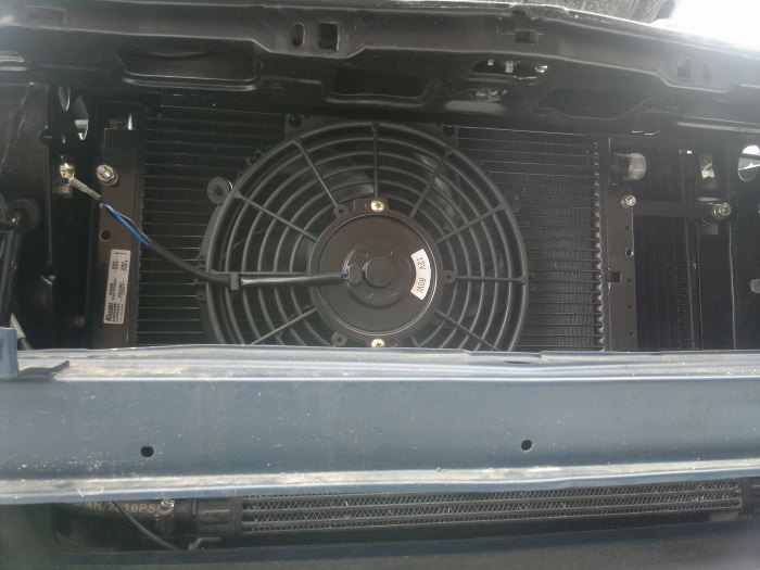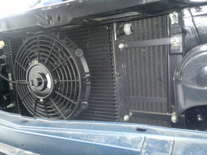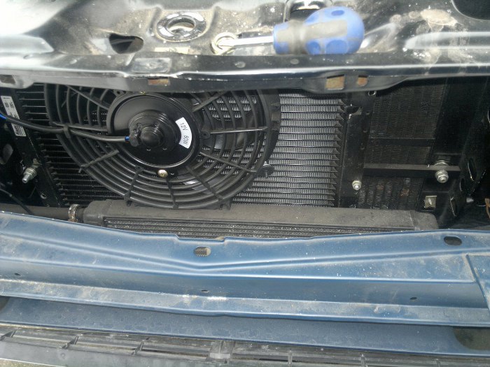 Przed chłodnicą też się już zrobiło gęsto. Znalazłem największy jaki się dało tu wpasować skraplacz klimatyzacji. Wolałem zastosować nowy niż ryzykować starym oryginalnym, zwłaszcza, że każdy, który miałem wyglądał na złom. Dorobiłem do tego nowe mocowania, wpasowałem też największy jaki się dało wiatrak elektryczny do wspomagania chłodzenia przy włączonej klimatyzacji. Po lewej stronie auta, czyli lewej stronie zdjęcia zostało jeszcze miejsce na osuszacz. Poniżej zderzaka, widoczna w otworze wentylacyjnym, jest zainstalowana chłodniczka oleju od skrzyni biegów. Doprowadzenie do niej płynu nie było wcale proste, nie mam nawet jak zrobić zdjęcia jak to rozwiązałem - tak mało jest tam miejsca.
