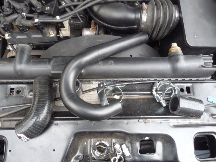Rozwiązanie kolejnego problemu związanego z umieszczeniem w Granadzie silnika ze Scorpio. Widzisz po lewej stronie wejście cieczy do chłodnicy. Do niego muszę doprowadzić ciecz chłodzącą z króćca z silnika, kóry widzisz między cewkami a plastikowym kolankiem dolotu. Tuż poniżej cewek jest jeszcze obieg cieczy chłodzącej do nagrzewnicy i kręcące się koła pasowe, które tylko czychają na zabłąkane, źle umocowane rurki chłodzenia... Nie było żadnej opcji, żeby to rozsądnie połączyć. Dlatego z rurek ze stali nierdzewnej został wyspawany widoczny element w kształcie litery J. Płaskownik widoczny przy jego końcu służy do przymocowania go pod jedną ze śrub mocujących cewki. Całość została pomalowana proszkowo, żeby nie rzucała się w oczy.