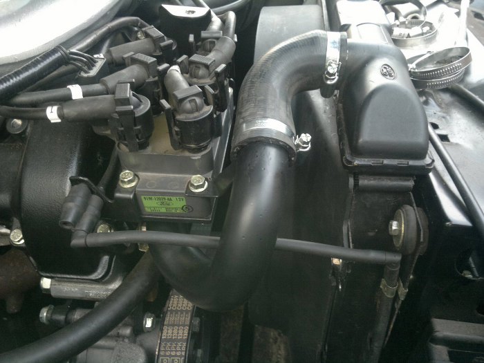 Zmontowany układ dolotowy, część przewodów zapłonowych, rezonator w układzie dolotu.