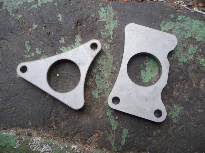 Do silnika dokupiłem oryginalne katalizatory, żeby wyjść z układem wydechowym od kolektorów wydechowych aż na dół auta. Są one bardzo ciężkie, dlatego miały mocowanie w okolicach dzwona skrzyni biegów. Ja używam jeszcze innej skrzyni biegów, gdzie tego mocowania nie było... Dlatego w końcu zrezygnowałem z użycia tych katalizatorów - obawiałem się, że będą za ciężkie i w końcu coś urwą. Mocowania nie było jak dorobić. W końcu odrysowałem z nich flansze mocujące do kolektorów wydechowych i poprosiłem kolegę o wycięcie mi tego ze stali nierdzewnej. Efekt widać na zdjęciu.