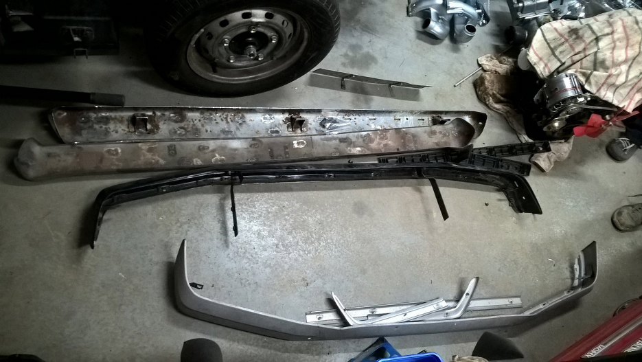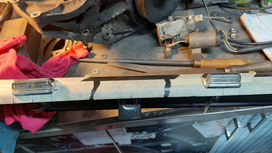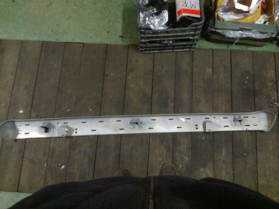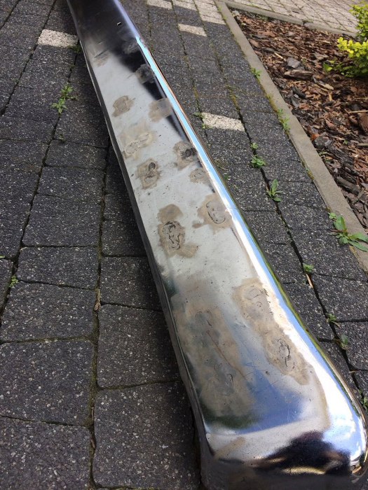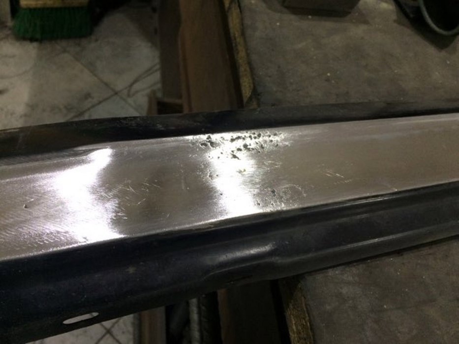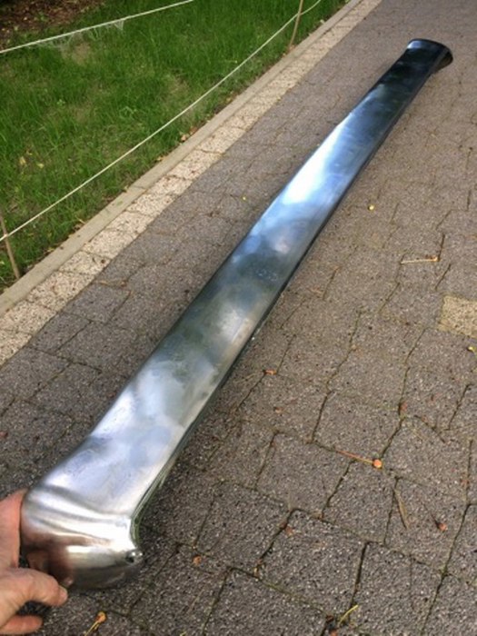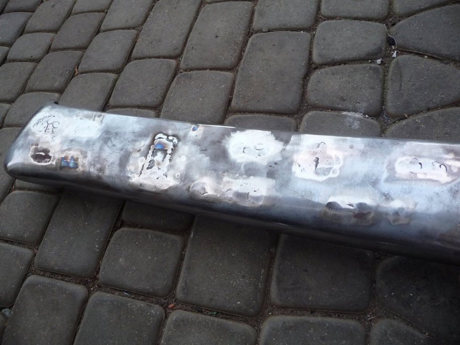 Górna listwa zderzaka, chromowana, składa się oryginalnie z trzech części. Te trzy części zostały do siebie dopasowane i zespawane w jeden element. Teraz zderzak jest dwu-, a nie czteroczęściowy. Po malowaniu proszkowym wygląda na aucie o tak. Dokładnie o to mi chodziło!
