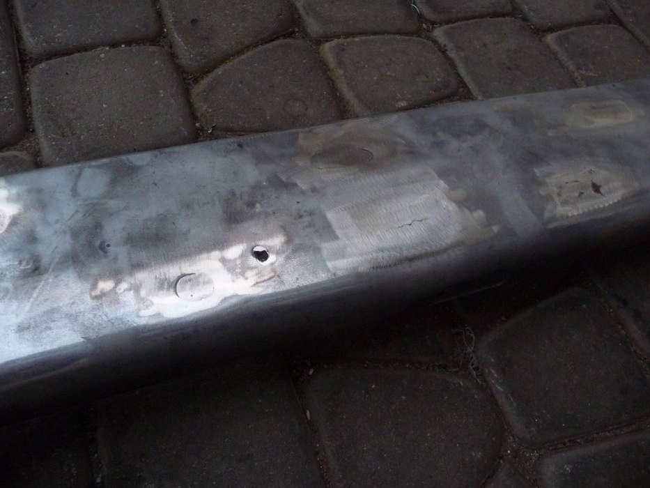 Dlatego właśnie oddałem zderzaki Zapkowi. Udało mi się dorwać drugi zderzak tylny, nadal z otworami, ale tym razem stwierdziłem, że ja tego nie sknocę, jeśli już, niech zrobi to ktoś inny. Niestety, nie sknocił, tak wygląda zderzak po zaspawaniu otworów przez Zapka.
