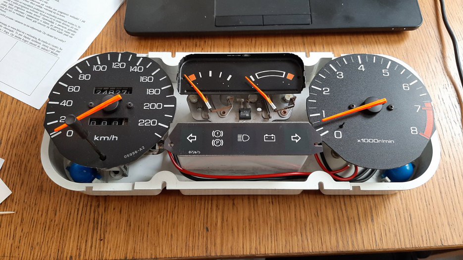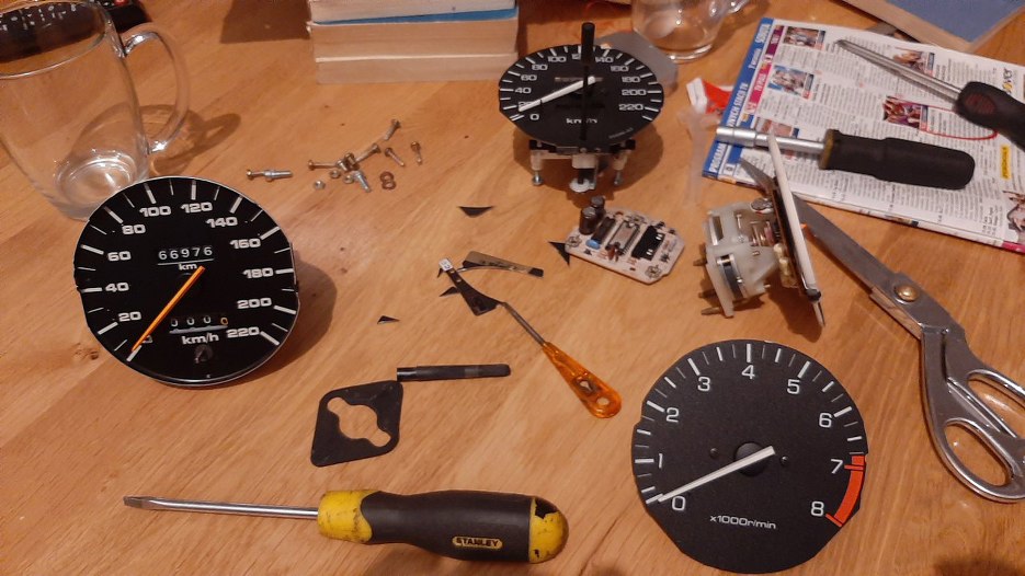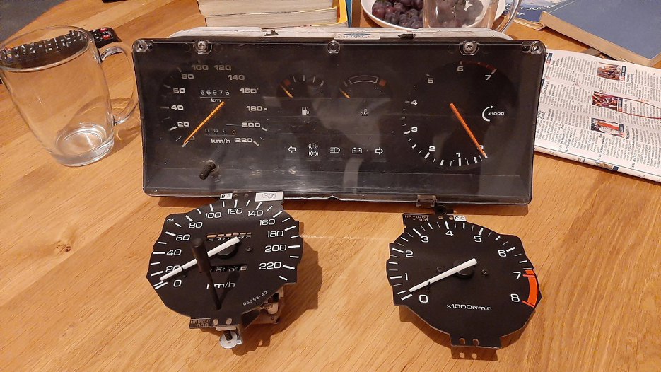 Kolejną rzeczą, którą się zająłem, były zegary. Chciałem używać oryginalnych Granadowych i nie miałem żadnego zamiaru bawić się w jakieś inne pomysły, ale... okazało się, że linka prędkościomierza ze skrzyni przepięknie wchodzi praktycznie na samą rurę wydechową. Musiałbym się nieźle namęczyć, żeby to ominąć. W końcu stwierdziłem, że chrzanię. Mam sygnał prędkościomierza idący do komputera silnika, z niego skorzystam. Czyli muszę mieć licznik, który to obsłuży. Koledzy z forum capri.pl podpowiedzieli mi zegary z Hondy Civic VI. Poprosiłem znajomego o przerobienie mi ich z 4 cylindrowego obrotomierza na 6 cylindrowy. No to mam zegary z Hondy. Rozmiar jak trzeba, czcionka nawet zbliżona. Trzeba je tylko włożyć w obudowę z Granady.