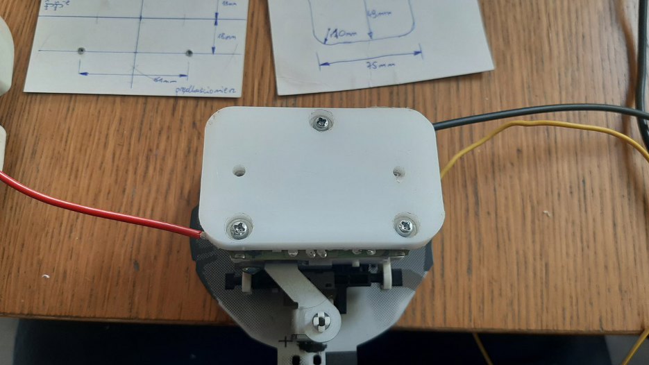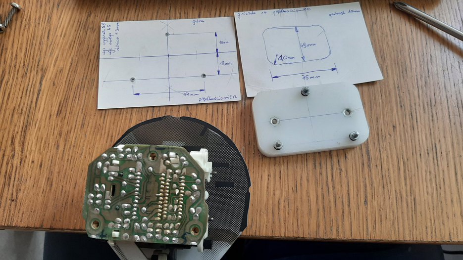 Z klocka polietylenowego wyciąłem kształt wchodzący w oryginalne gniazdo prędkościomierza w zegarach Granady. Powierciłem otwory.