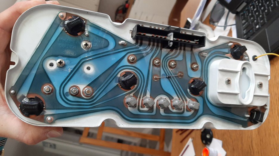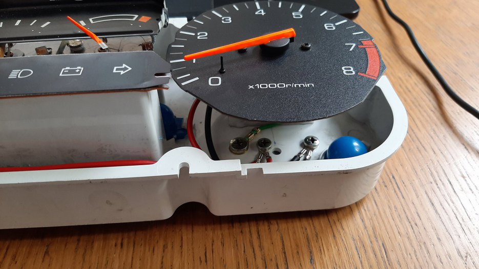 Potem podobny klocek zrobiłem do obrotomierza. W oryginalne trzy śrubki obrotomierza podłączyłem zasilanie i obrotomierza i prędkościomierza. Sygnał obrotomierza również. Musiałem nieco podciąć jedną oprawkę żarówki podświetlenia zegarów, żeby się wszystko zmieściło.