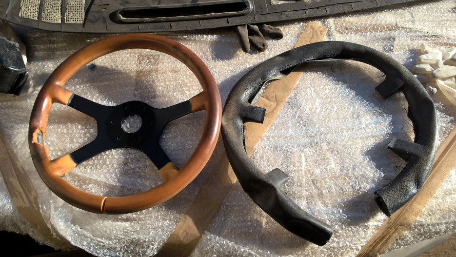 W międzyczasie też chciałem coś zrobić z akcesoryjną kierownicą RS. Miałem ja kiedyś obszytą na nowo, ale niestety dość podle i szybko się zrobiła bardzo brzydka. Dlatego zerwałem z niej obszycie. Ramiona oczyściłem i pomalowałem.