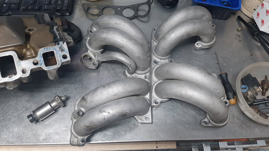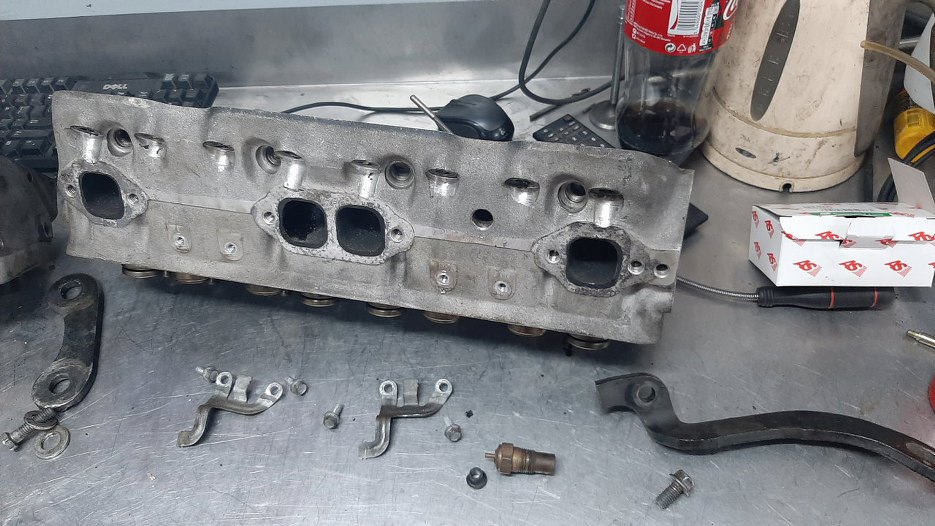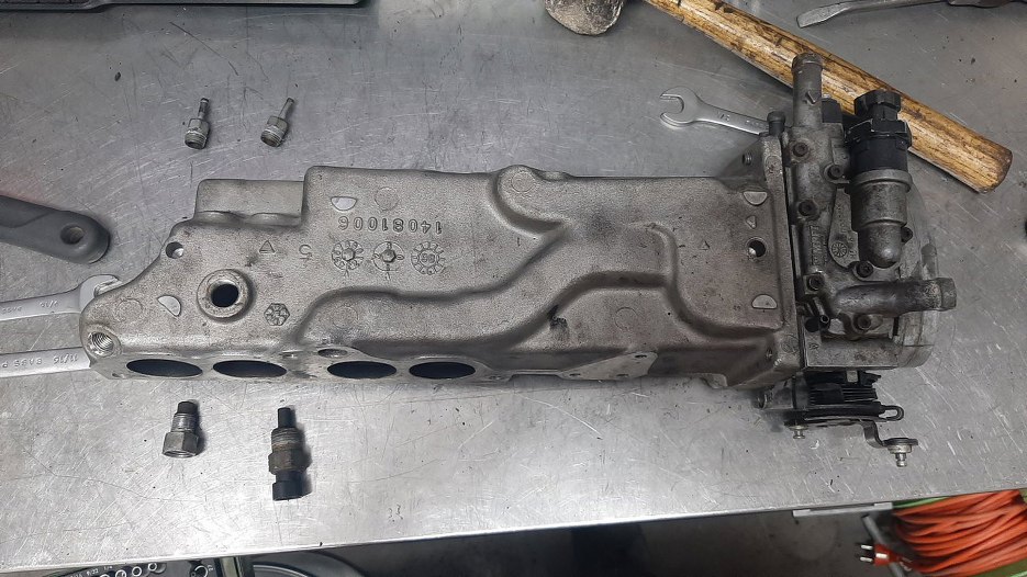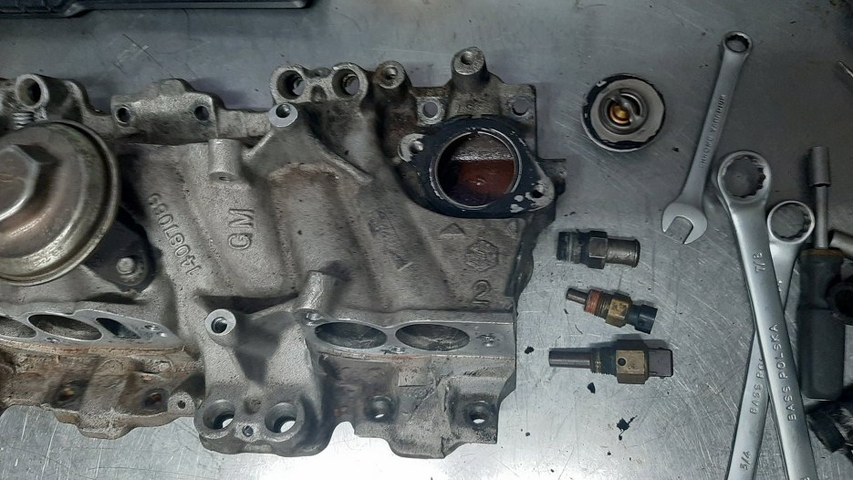 Wykręciłem też króćce, czujniki i takie tam. Co ciekawe, kolektor i głowice są aluminiowe, a kolanko termostatu, chyba łatwiejsze do wykonania, jest jednak żeliwne.