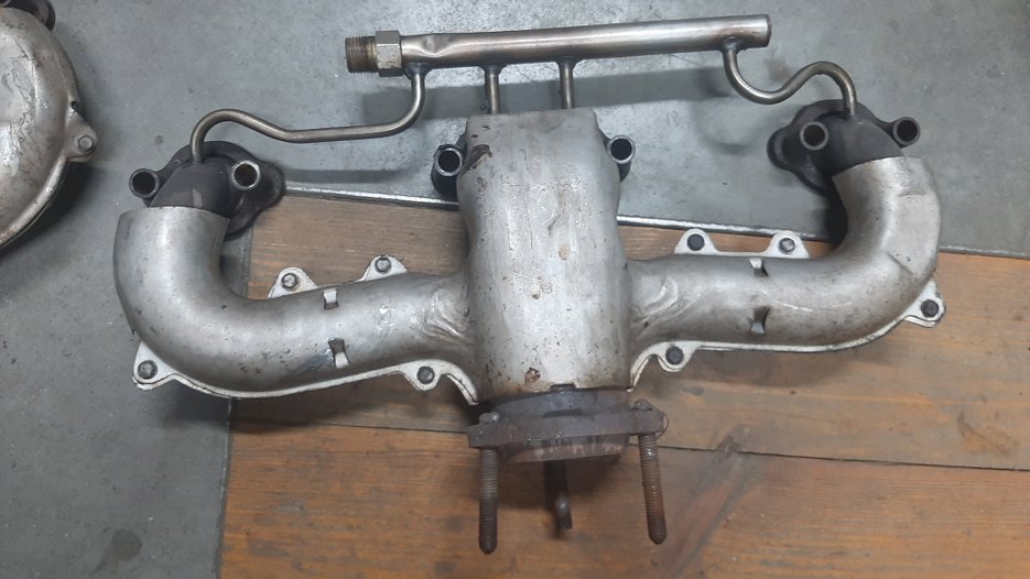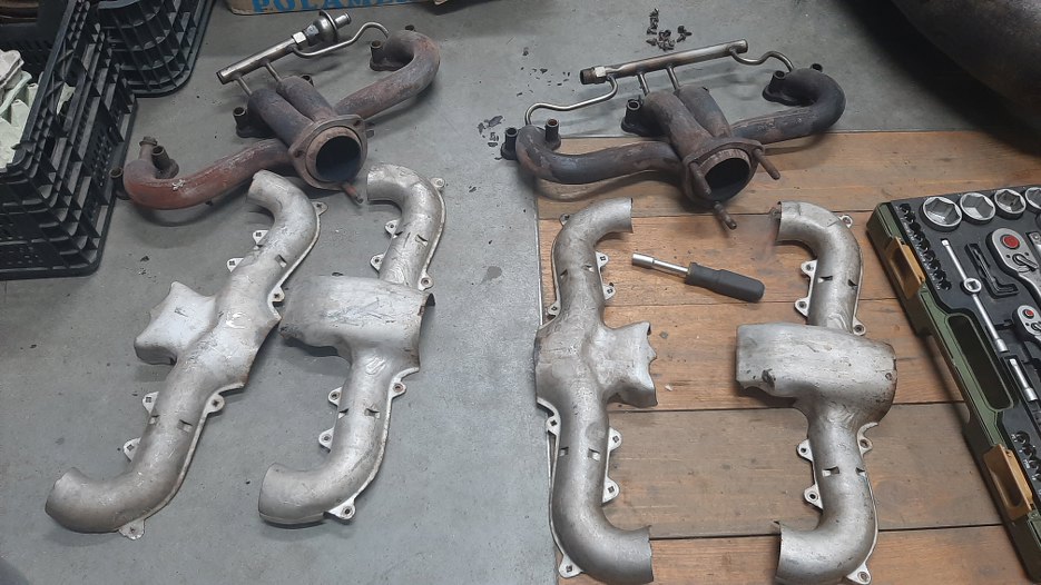 Osłony zdjęte, będą ocynkowane. W kolektorach wydechowych widać wspawane rureczki do systemu nadmuchu powietrza i recyrkulacji spalin. Mocno, bardzo mocno mnie korci, żeby je wyciąć.