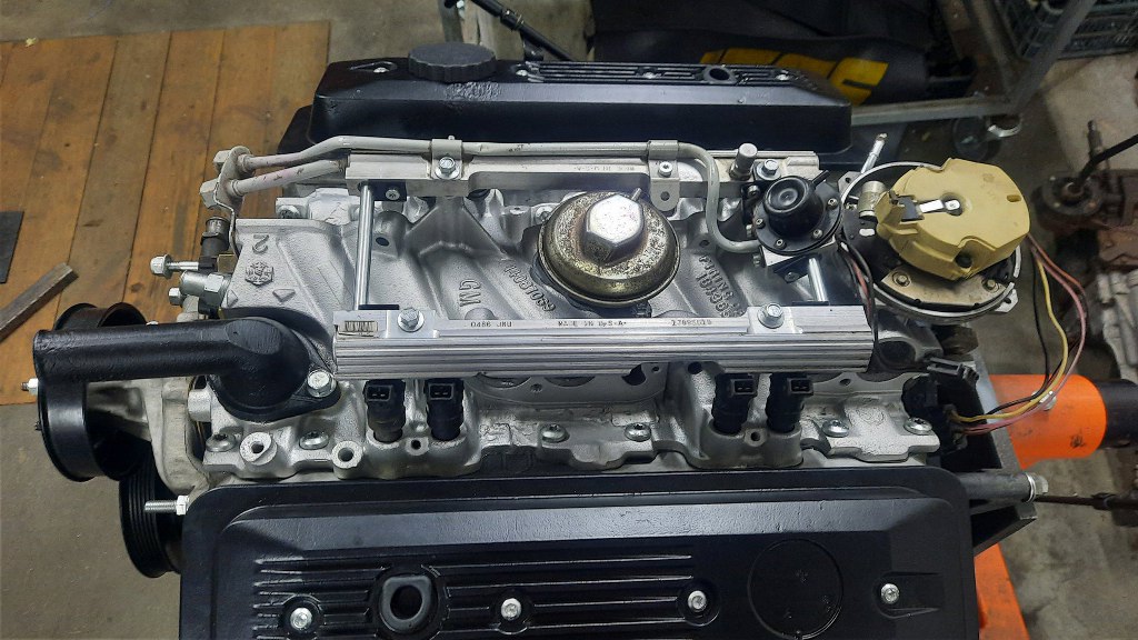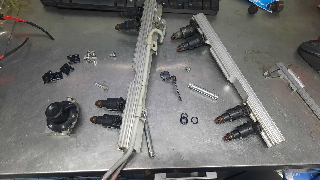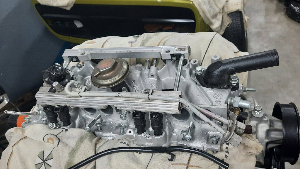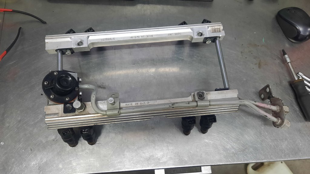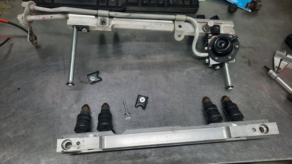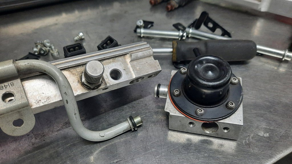 Dużo, dużo wcześniej rozkręciłem listwy paliwowe, bo miały zardzewiałe klipsy trzymające rurki. Teraz mam te klipsy odnowione, mogę to poskładać. Samych wtrysków nie dotykam, wyglądają na czyste. W razie czego są na wierzchu, łatwo się do nich dostać.