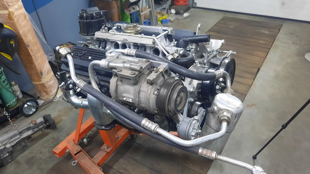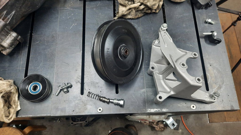 Przykręciłem też łapę mocującą kompresor klimatyzacji i napinacz paska. Sam kompresor klimy nie mam pojęcia, czemu do mnie trafił, ale skoro był, to go przykręciłem Rozkręcać go nie będę :). Są przy nim rurki i osuszacz, co trochę zajmuje miejsca... Osuszacz oczywiście będzie do wymiany.