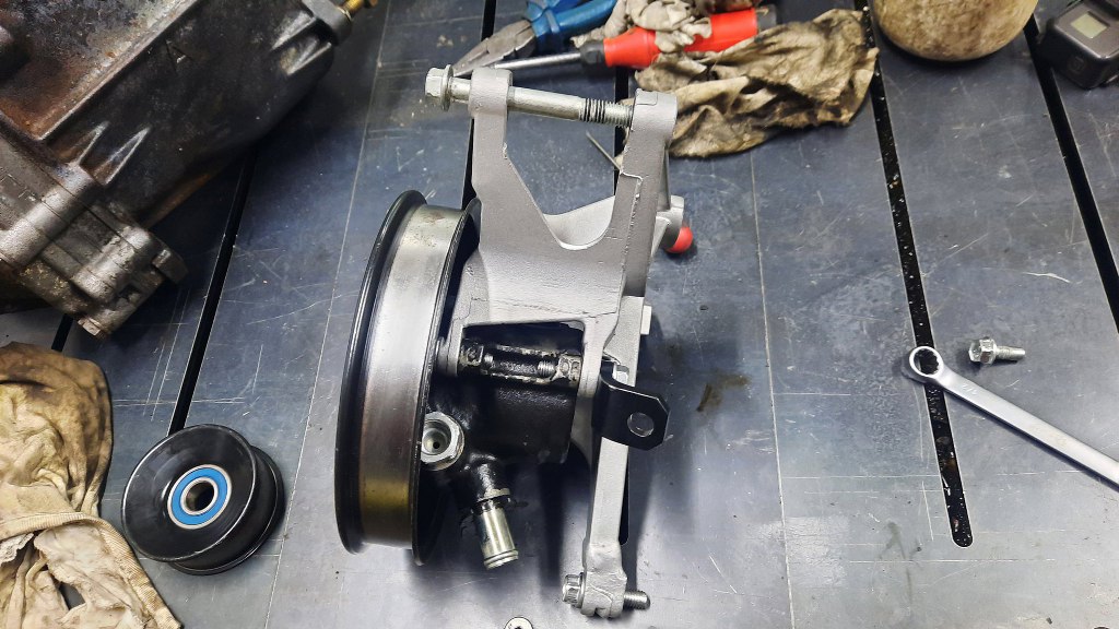 Pompy wspomagania nie ruszałem, nie wygląda na to, żeby było trzeba. Odnowiłem tylko śruby ją mocujące i króciec trzymający zaworek (był zardzewiały). Łapa jest po szkiełkowaniu.