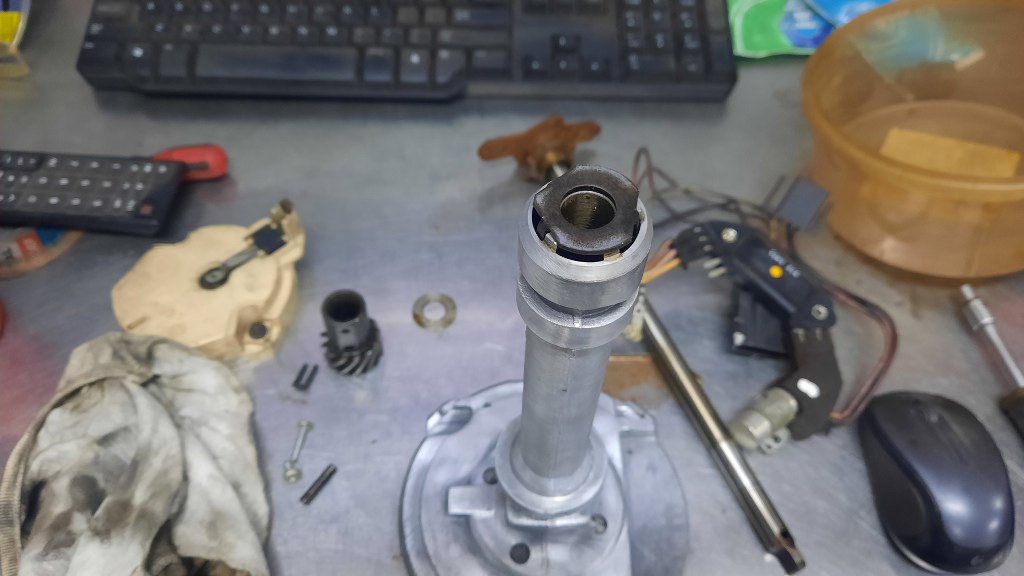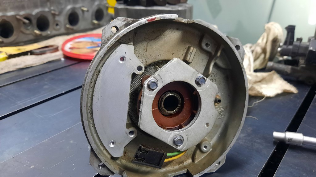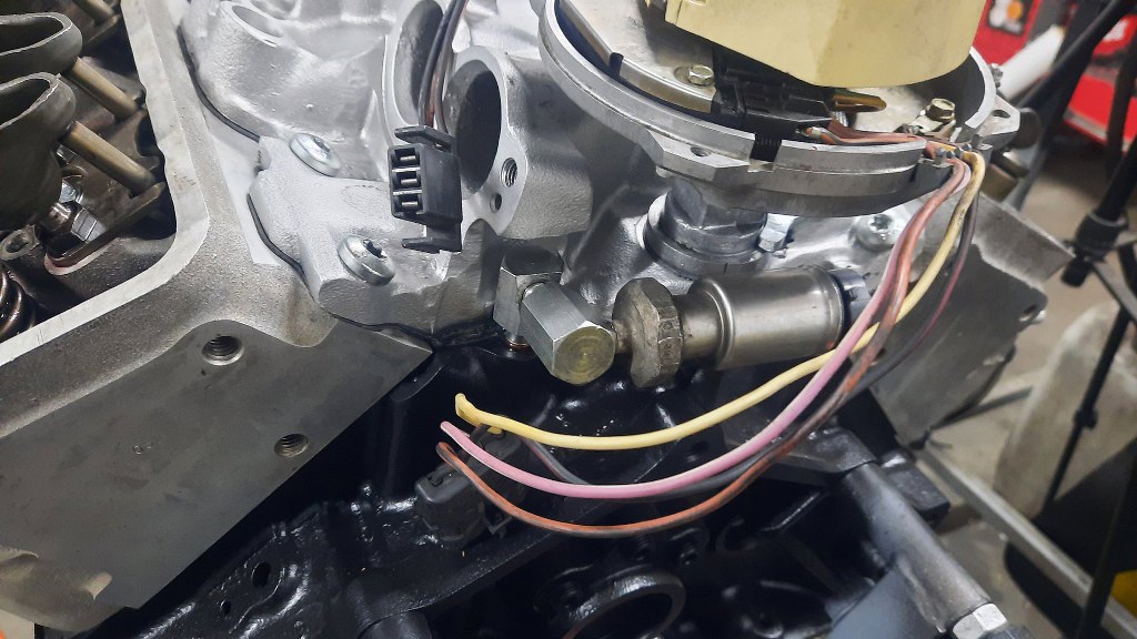 Zanim jednak założyłem aparat, przykręciłem czujnik ciśnienia oleju. Zielonego pojęcia nie mam, czy jest w dobrej pozycji, bo oczywiście dostałem go luzem... ale w razie czego łatwo jest go odkręcić i przykręcić inaczej. Aparat zapłonowy miał przez kogoś zaznaczoną pozycję, w której był w silniku. Co ciekawe, po ustawieniu silnika w GMP pierwszego cylindra, a następnie ustawieniu palca rozdzielacza w aparacie na pierwszy cylinder, aparat ustawiony jest dość równo w silniku - wystające części na kopułce (później ją założę) są prostopadle do osi silnika. I wtedy też pokrywa się znak, który ktoś kiedyś zrobił na aparacie. Ciekawe. Może to nawet będzie działać? :).