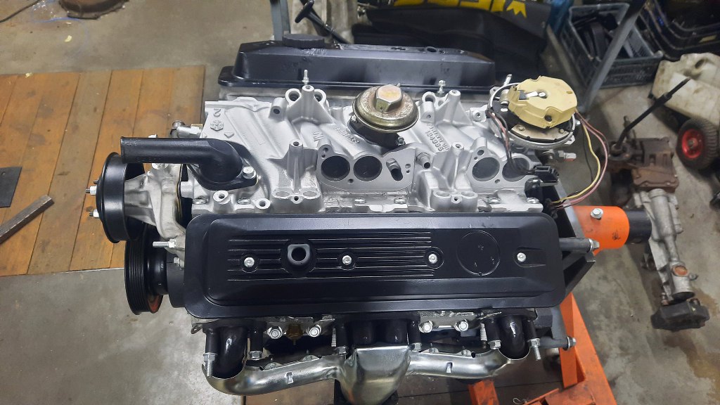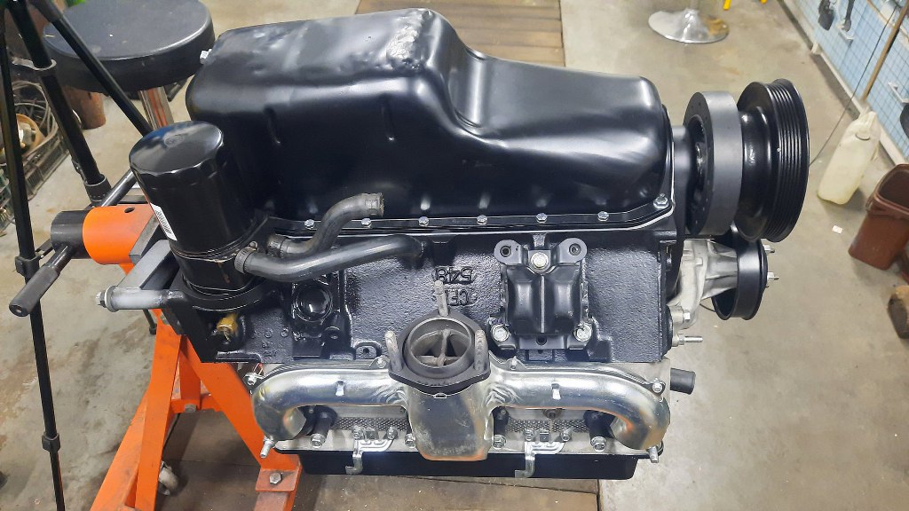 Wróciła też z piaskowania oryginalna miska olejowa, więc ją przykręciłem. To już zamyka mi silnik dookoła. Śrub do miski co prawda nie znalazłem w wiaderku ze śrubkami, ale kupiłem nowe. Poniżej i po prawej od filtra oleju widać też brok, który ma lekko połyskujący czarny kolor - to jest ten jeden, którego musiałem wyciągnąć, żeby się dostać do broka leżącego w środku bloku. Przyszły nowe, więc go uzupełniłem i pomalowałem na czarno. Tu lakier jest świeżo psiknięty, stąd połysk :).