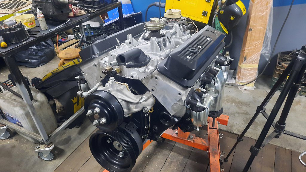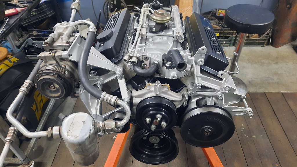Przykręciłem też drugą łapę, po lewej stronie silnika (na zdjęciu po prawej). Na niej jest pompa wspomagania (już przykręcona), pompa powietrza do wydechu (to, co wywaliłem) i alternator (jeszcze nie gotowy).