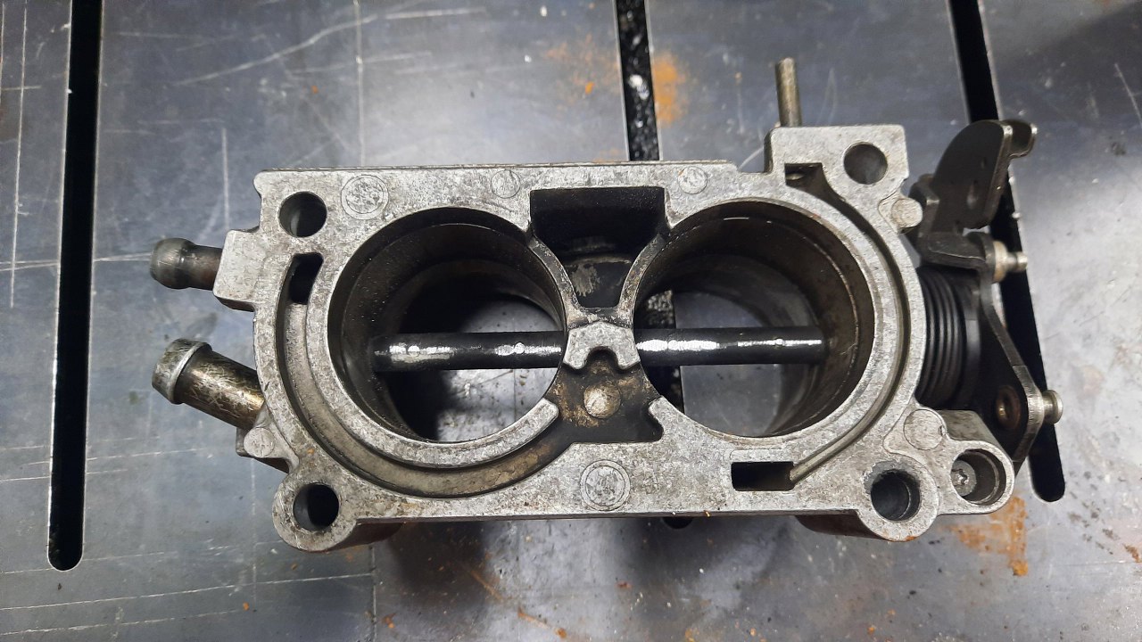 Potem udało mi się odwiercić resztki śrubek nie uszkadzając gwintów. O tyle ciężko się to robi, że są to małe średnice, ale śrubki nierdzewne, czyli dość twarde. Potem wrzuciłem korpus przepustnicy do myjki ultradźwiękowej. Po umyciu zacząłem składać. Tu widać czyste płytki przepustnic przykręcone juz nowymi śrubkami.