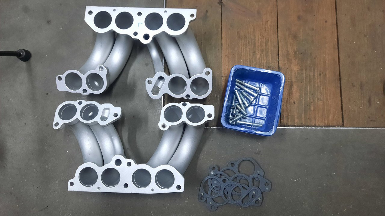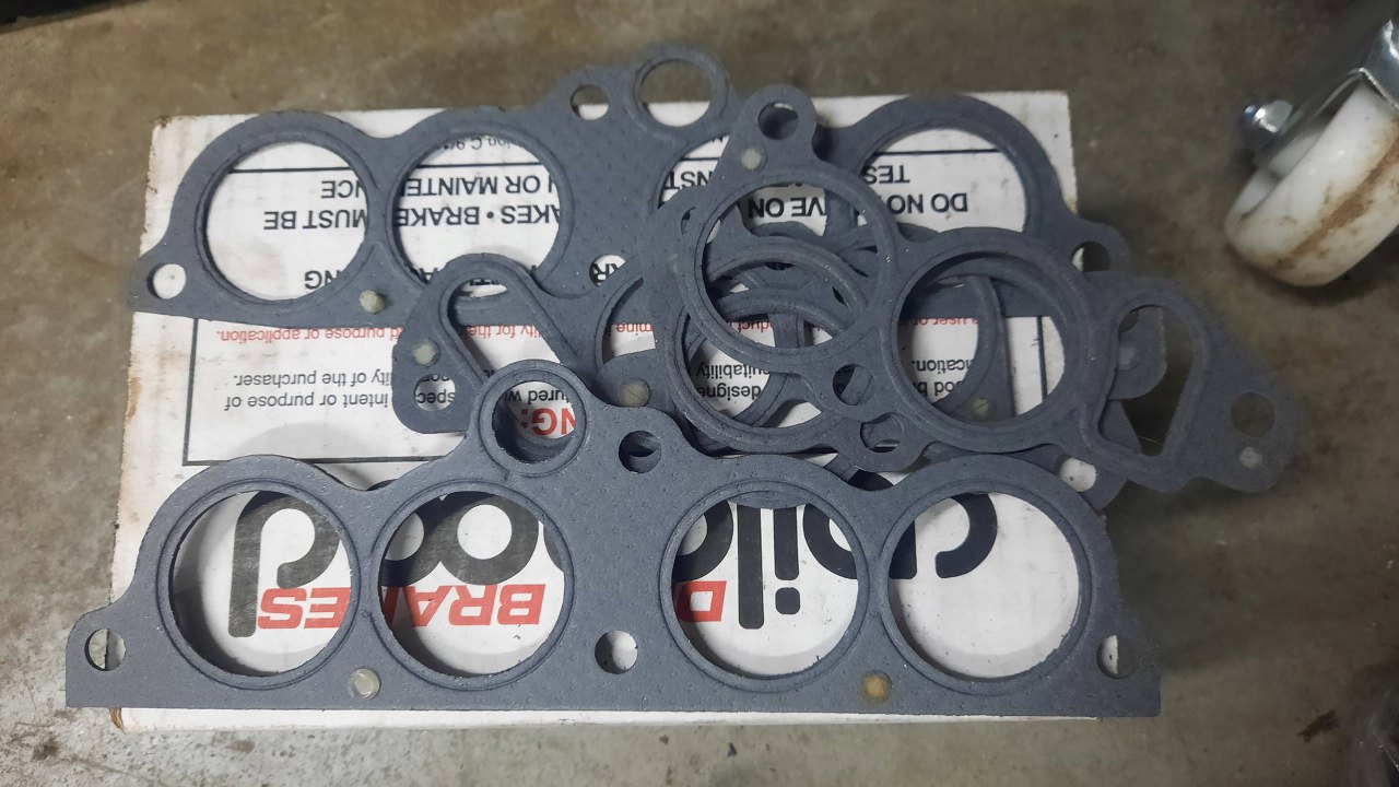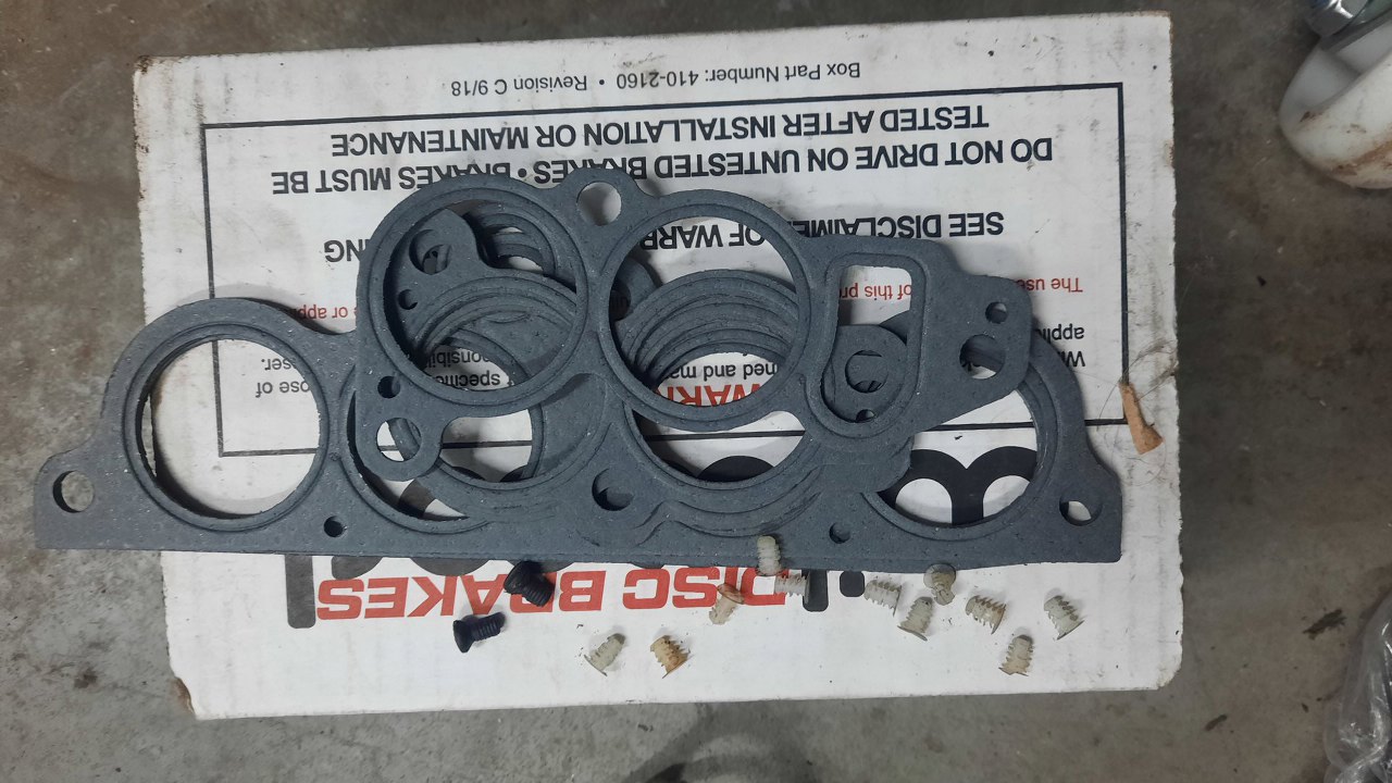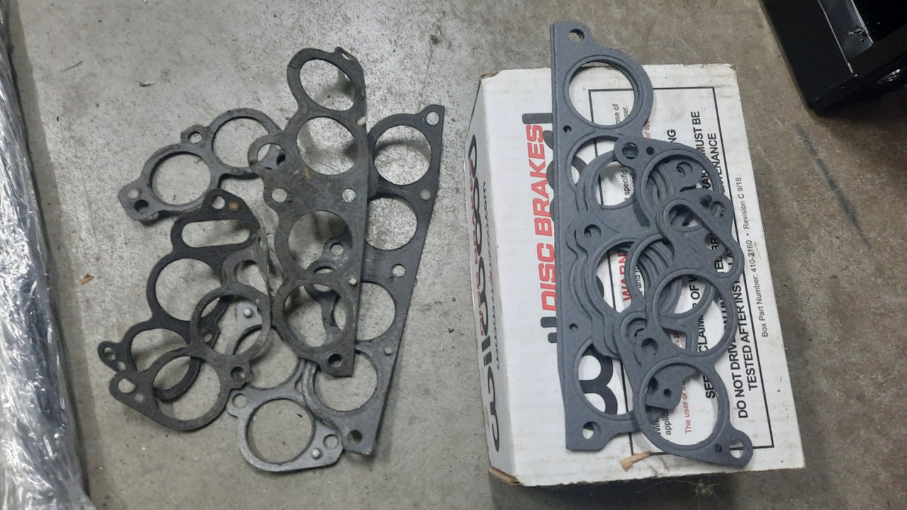 Zacząłem się przymierzać do przykręcenia dolotu, czyli airboxa. I tu przydała się moja cecha chomikowania, czyli to, że nie wyrzucam nic, dopóki wiem, że na 100% nie będzie mi potrzebne. Po lewej stronie są stare uszczelki do kanałów dolotowych Mają one takie fikuśne plastikowe kołeczki do przytrzymania uszczelek na miejscu podczas przykręcania. Po prawej są nowe uszczelki.