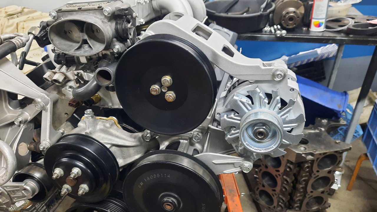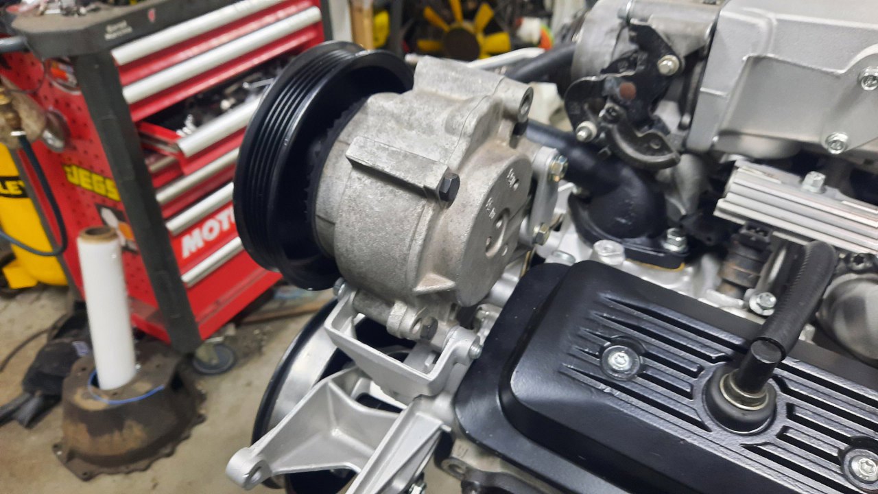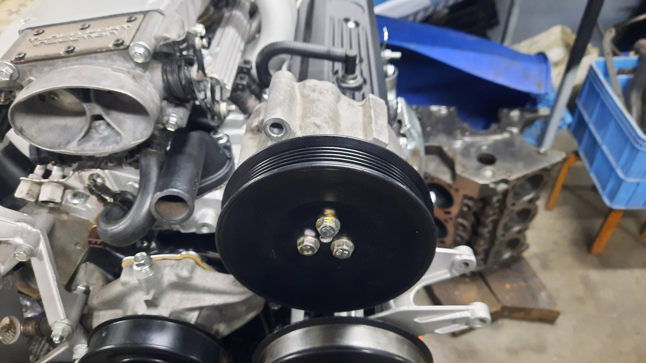 Potem przykręciłem pompę powietrza. To jest kawałek tej durnej, niedziałającej ekologii dmuchającej powietrze w wydech. Ponieważ wywaliłem to wszystko, to ta pompa nie byłaby potrzebna... gdyby nie to, że nie da się bez niej poprowadzić paska napędu osprzętu. Czyli cała pompa pełni w tej chwili funkcję tylko i wyłącznie uchwytu na kółko pasowe.