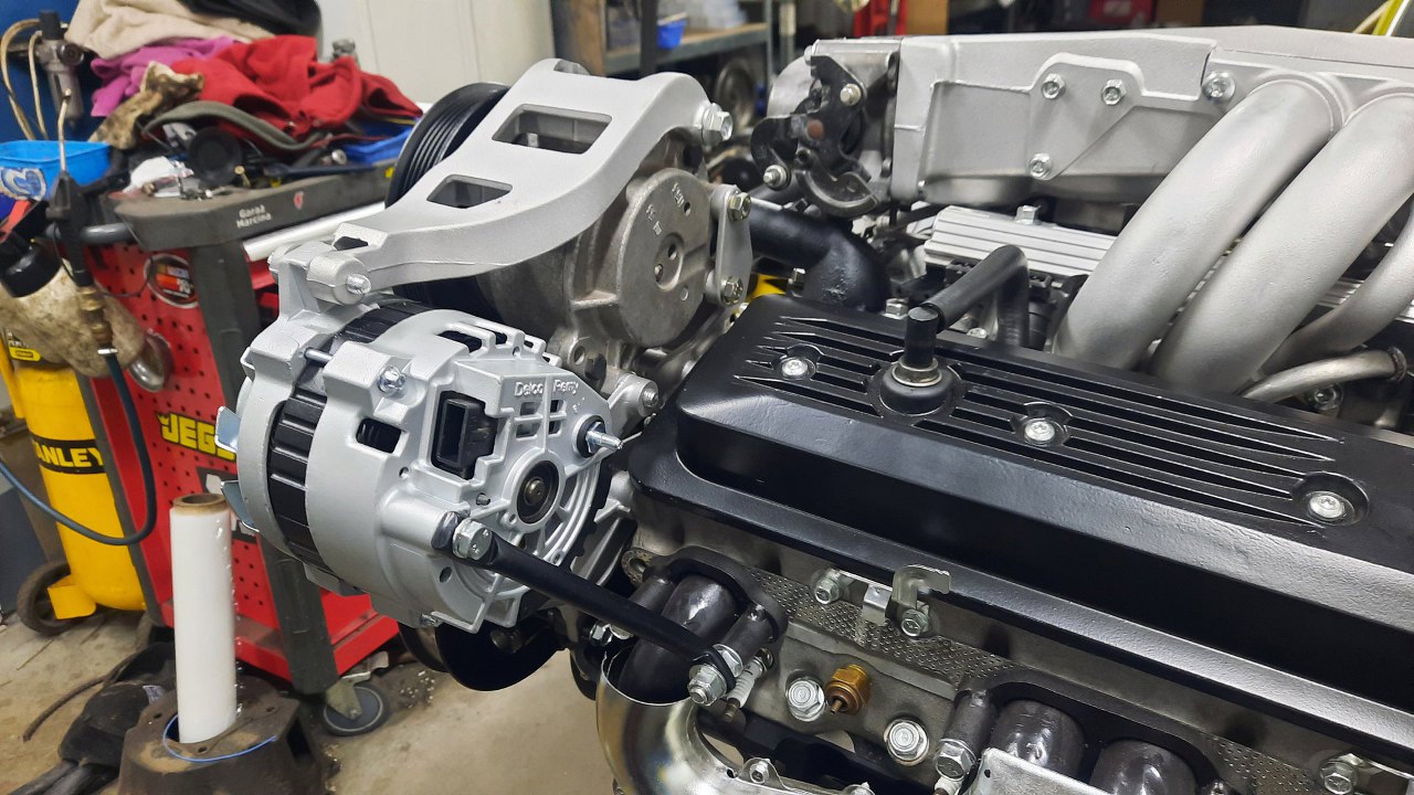 Potem alternator. On jedno mocowania ma u dołu, do stelażu przykręconego do silnika. U góry ma kolejne mocowanie, do tego pałąka, któego drugi koniec przykręcony jest do tej pompy powietrza. To jest kolejny powód, dla którego pompa powietrza zostaje na miejscu.