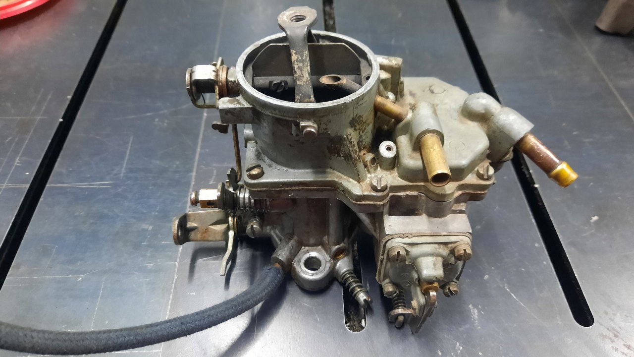 Jedyna rzecz, któej brakuje, to zapinka linki ssania. Powinna być na końcu tego płaskownika przykręconego pod śrubami pokrywy gaźnika. Jeśli została przy samochodzie, to ok, jeśli nie, to trzeba będzie wykombinować jakieś mocowanie.