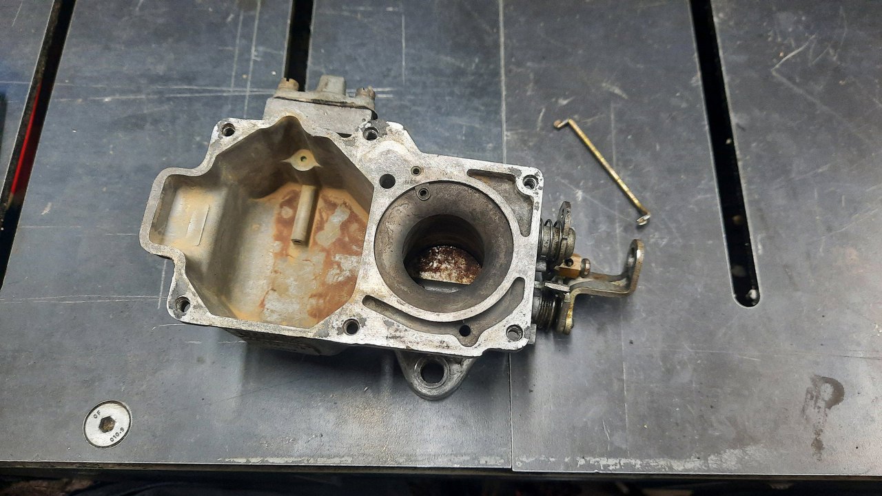 Udało mi się wywiercić jej resztkę na tyle, żeby uwolnić płytkę przepustnicy. Potem zeszlifowałem wystające części, żeby móc wyjąć oś przepustnicy.