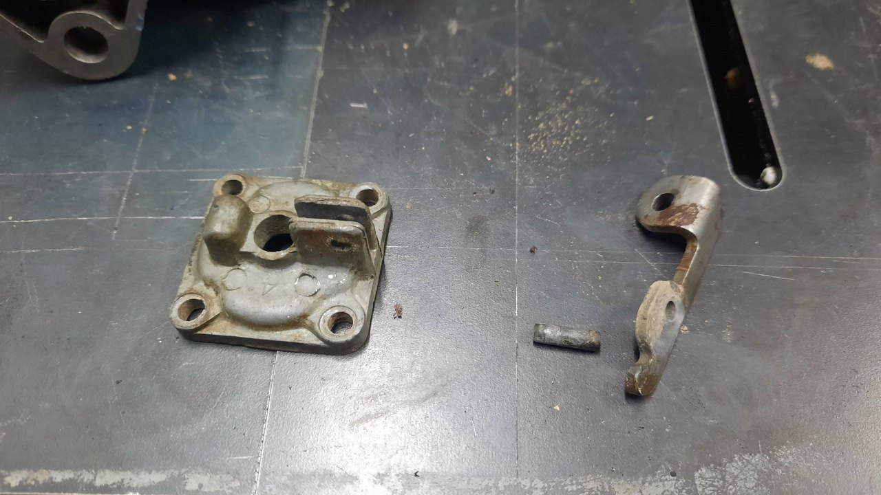 Żeby połapać się w chaosie części, zacząłem je układać tak, jak mają być złożone. Tu mechanizm przepustnicy. Jeszcze przed cynkowaniem udało mi się cienkim wiertłem wywiercić resztkę śrubki mocującej płytkę przepustnic. Udało mi się nawet uratować gwint w ośce.