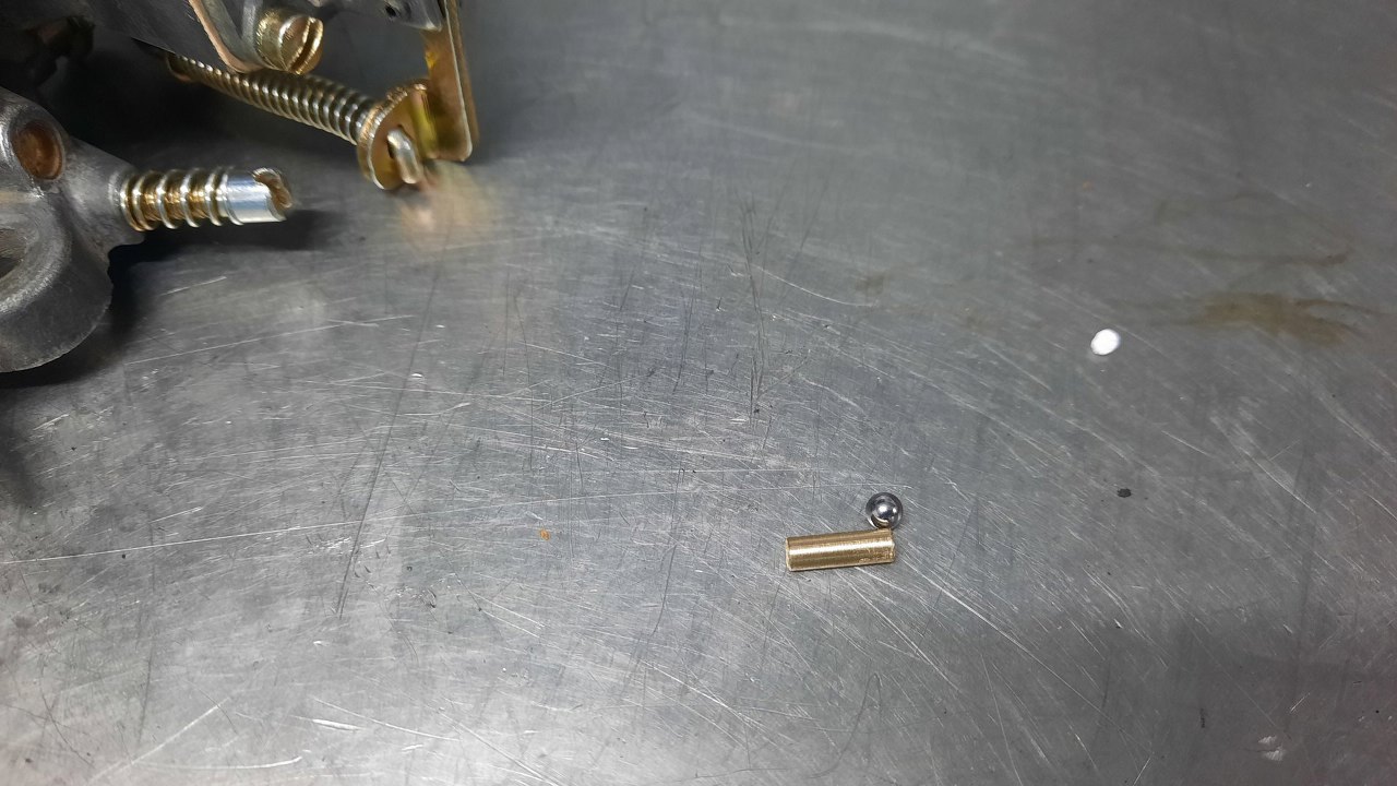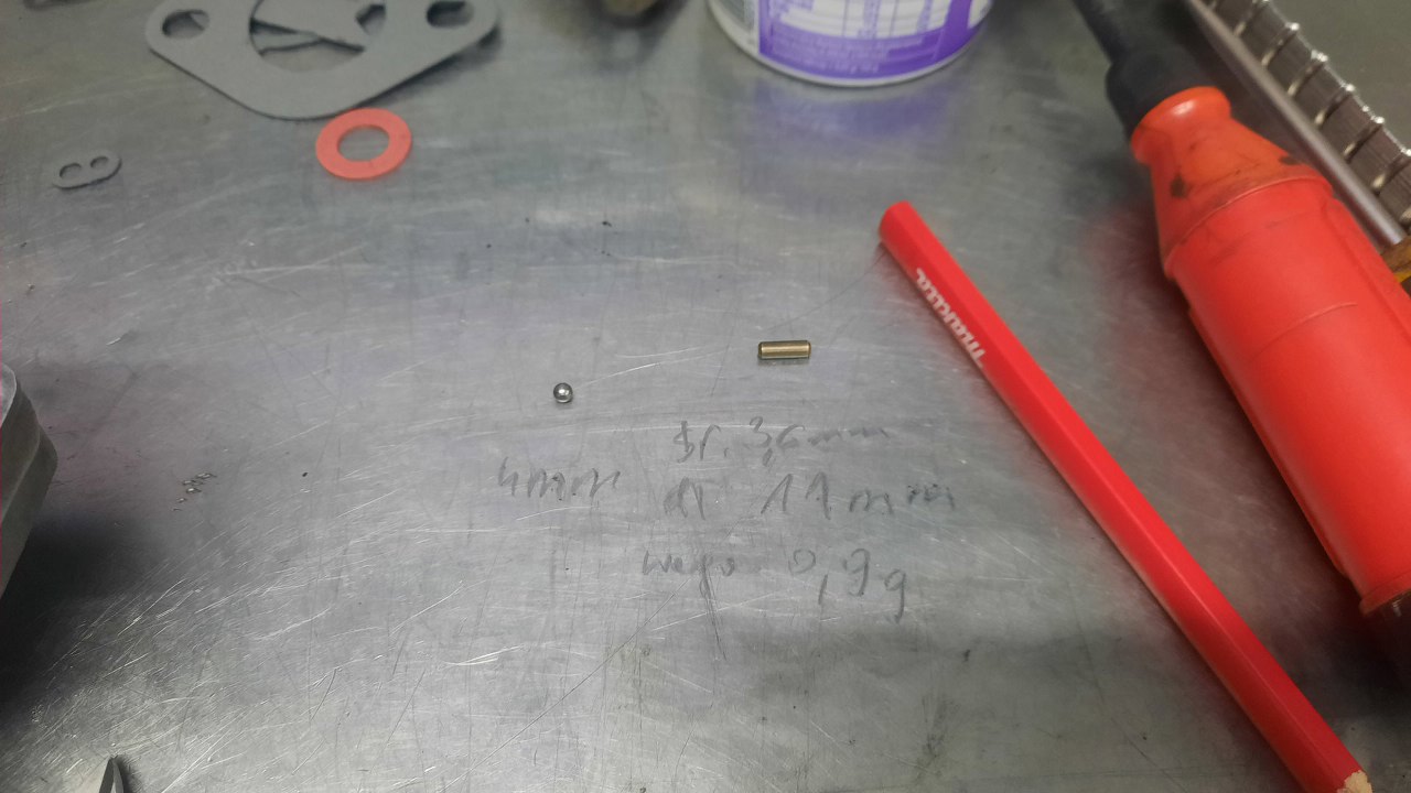 I doszedłem do momentu, w którym mógłbym przykręcić pokrywę gaźnika, ale jeszcze nie mogę - brakuje tej kulki i ciężarka. Jest to fragment mechanizmu pompki przyśpieszacza, coś w rodzaju zaworka zwrotnego. Te części są wzięte z innego gaźnika na wzór. Kulka to nie problem, po rozcięciu jakiegoś starego łożyska alternatora okazało się, że są w nim za duże, więc znalazłem właściwą kulkę, pasującą od jakiejś skrzyni biegów od simsona, czy coś. CIężarek dokładnie zwymiarowałem i zważyłem.