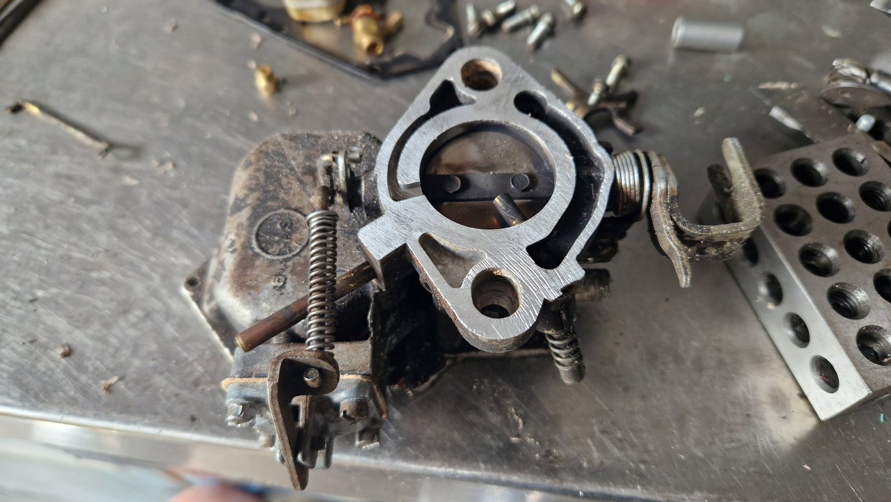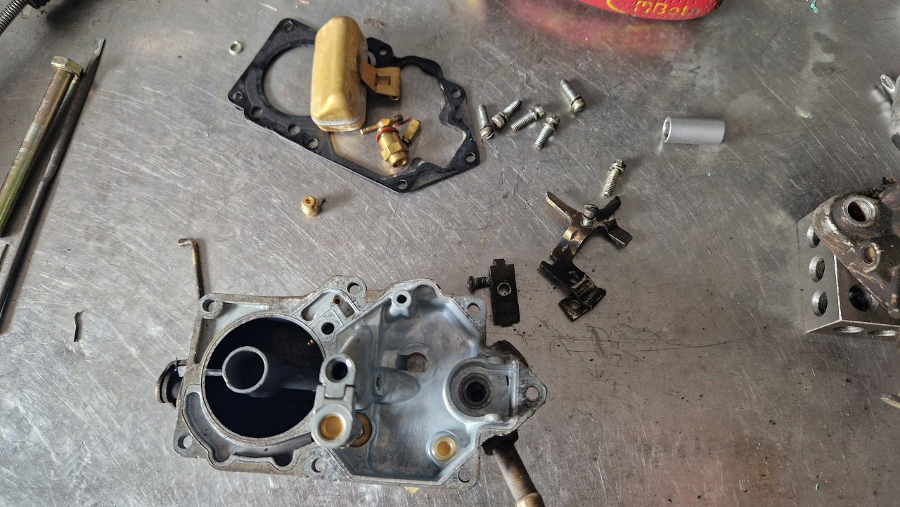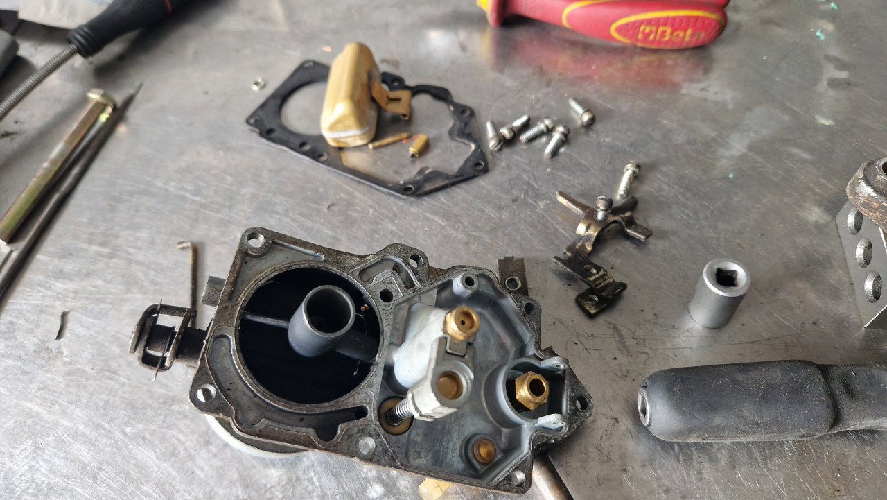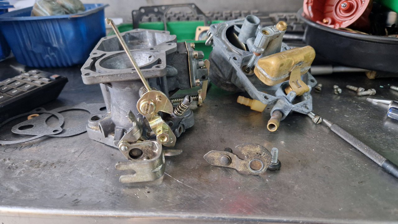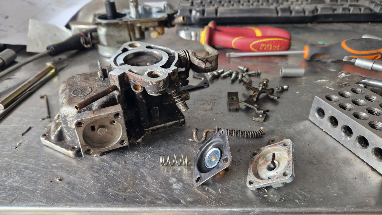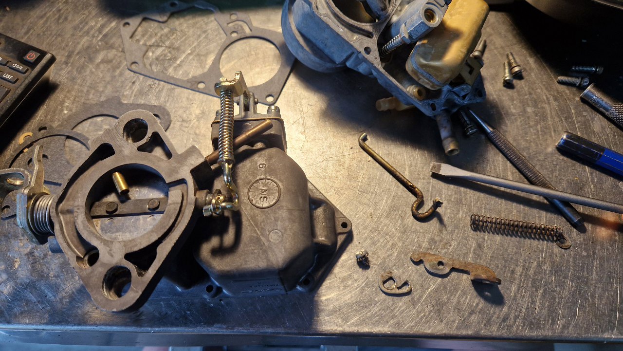 Nie wszystkie mam zapasowe, bo te gaźniki się zawsze czymś różnią. Tu złożyłem mechanizm ssania. Obok leży przygotowana pokrywa gaźnika.