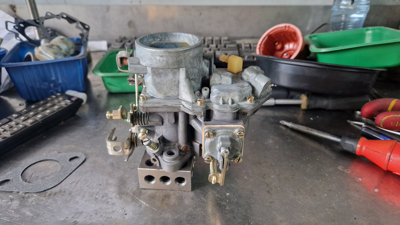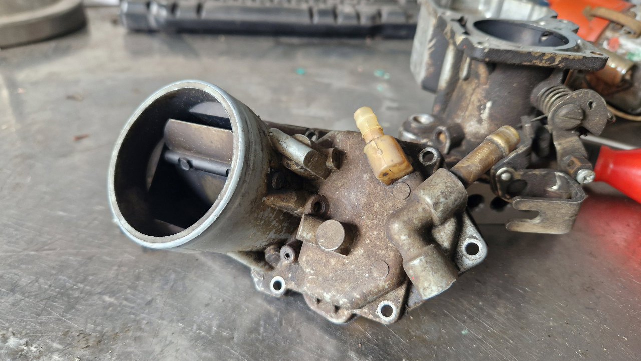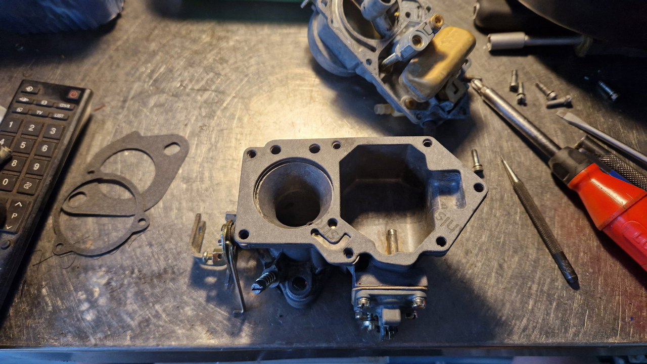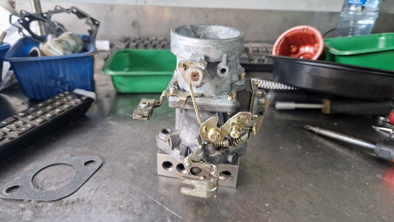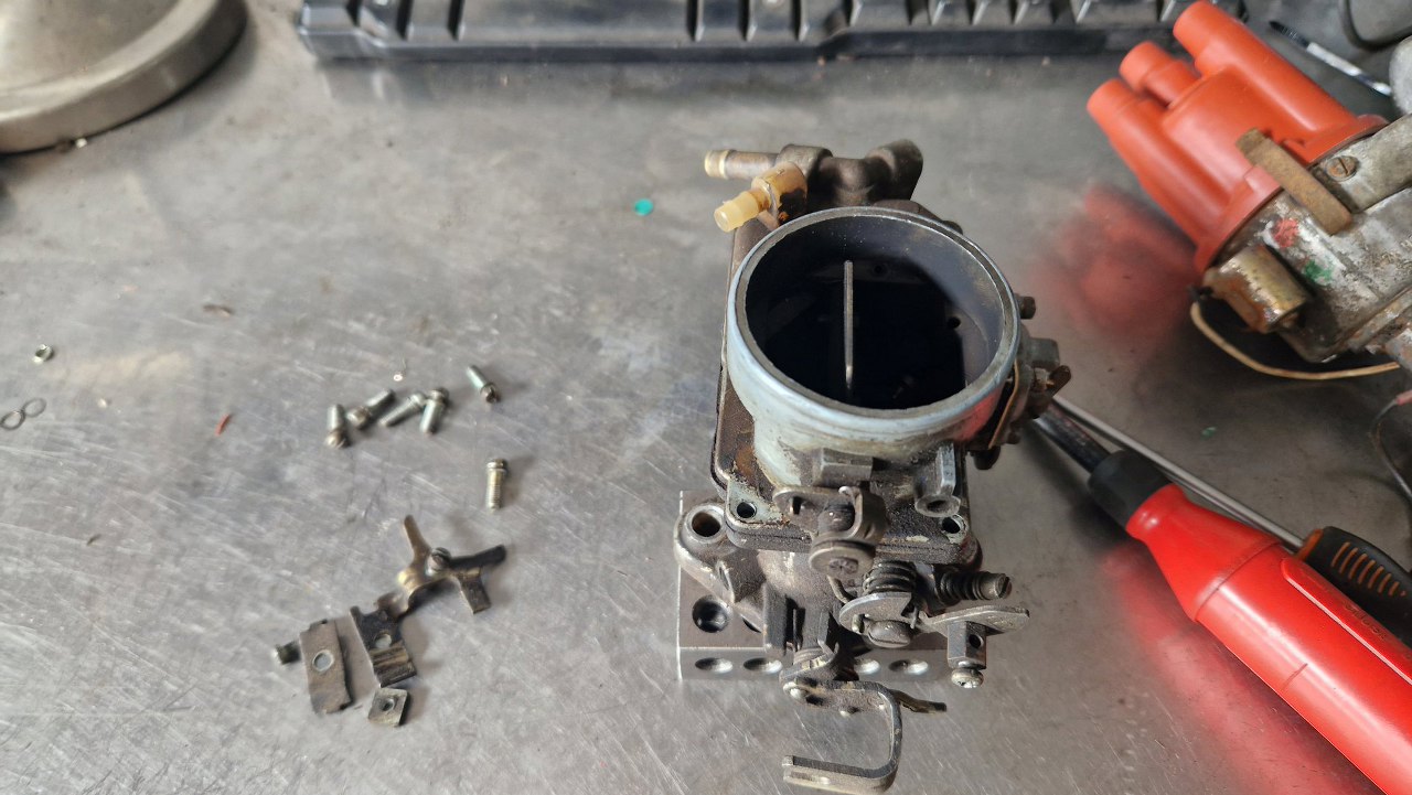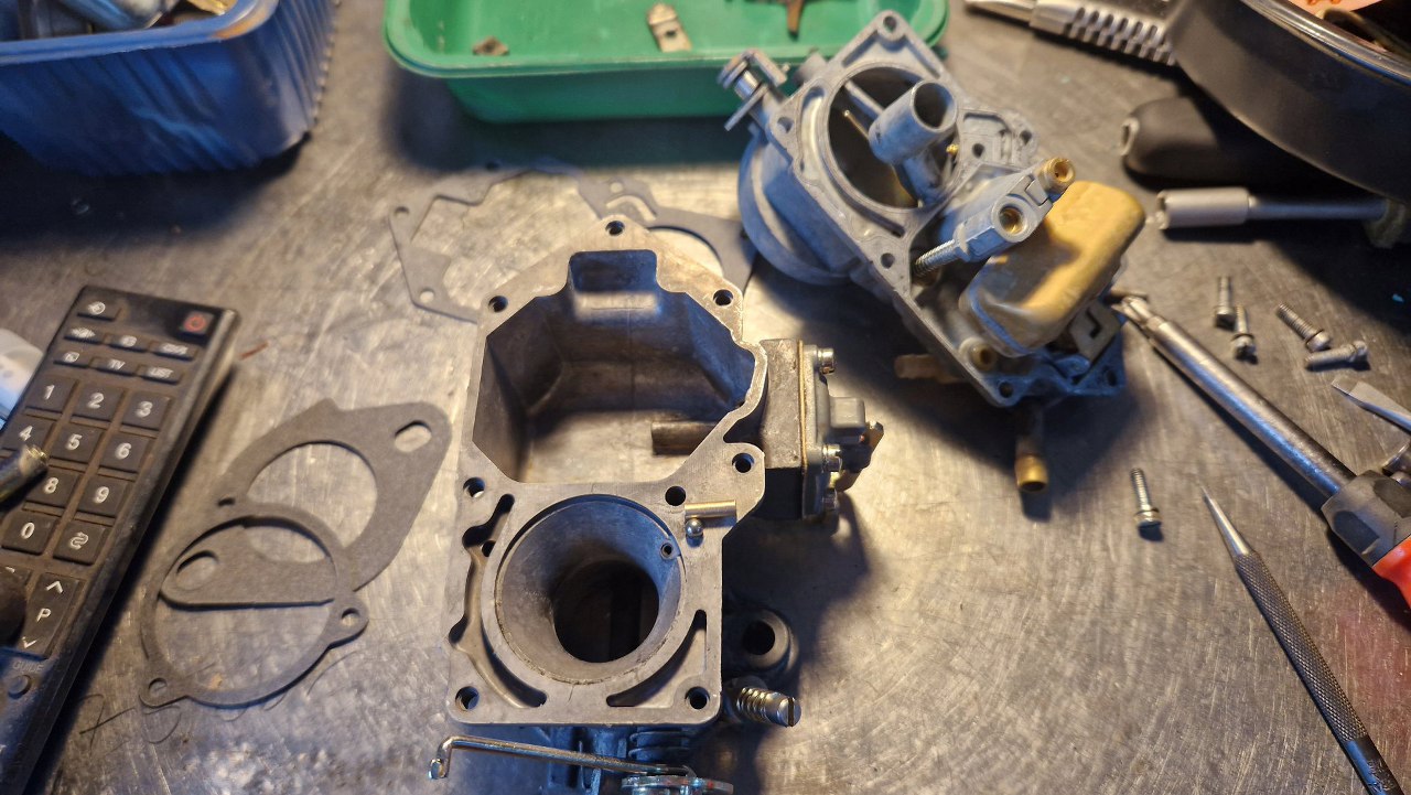 Nie wszystkie mam zapasowe, bo te gaźniki się zawsze czymś różnią. Tu złożyłem mechanizm ssania. Obok leży przygotowana pokrywa gaźnika.