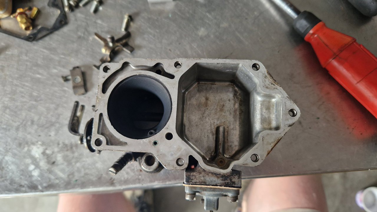 W korpusie gaźnika widzę dwie rzeczy - tu też jest czysto, ale, co ważniejsze, moja diagnoza była trafna: brakuje kulki i ciężarka od pompki przyśpieszacza. Ktoś tu już był w środku.
