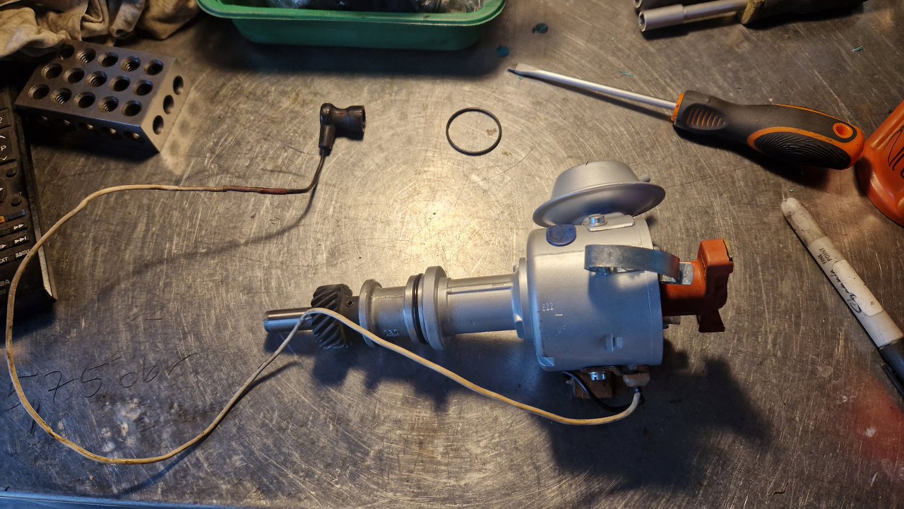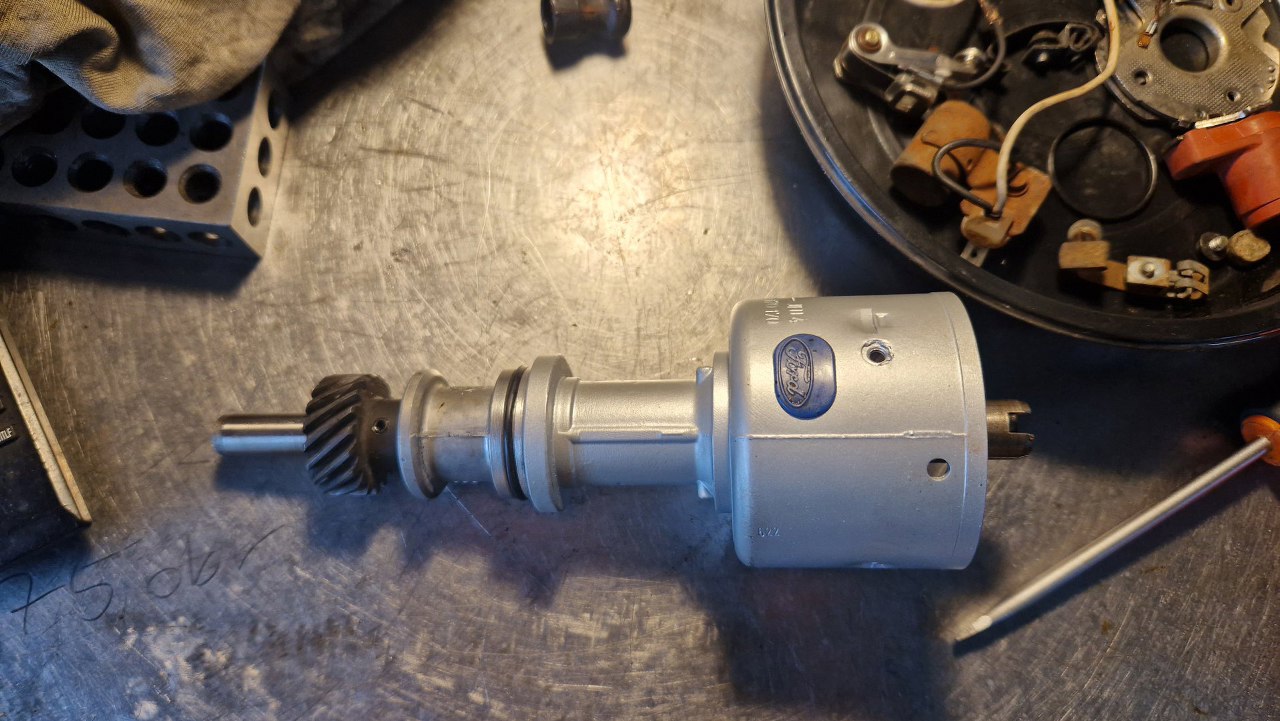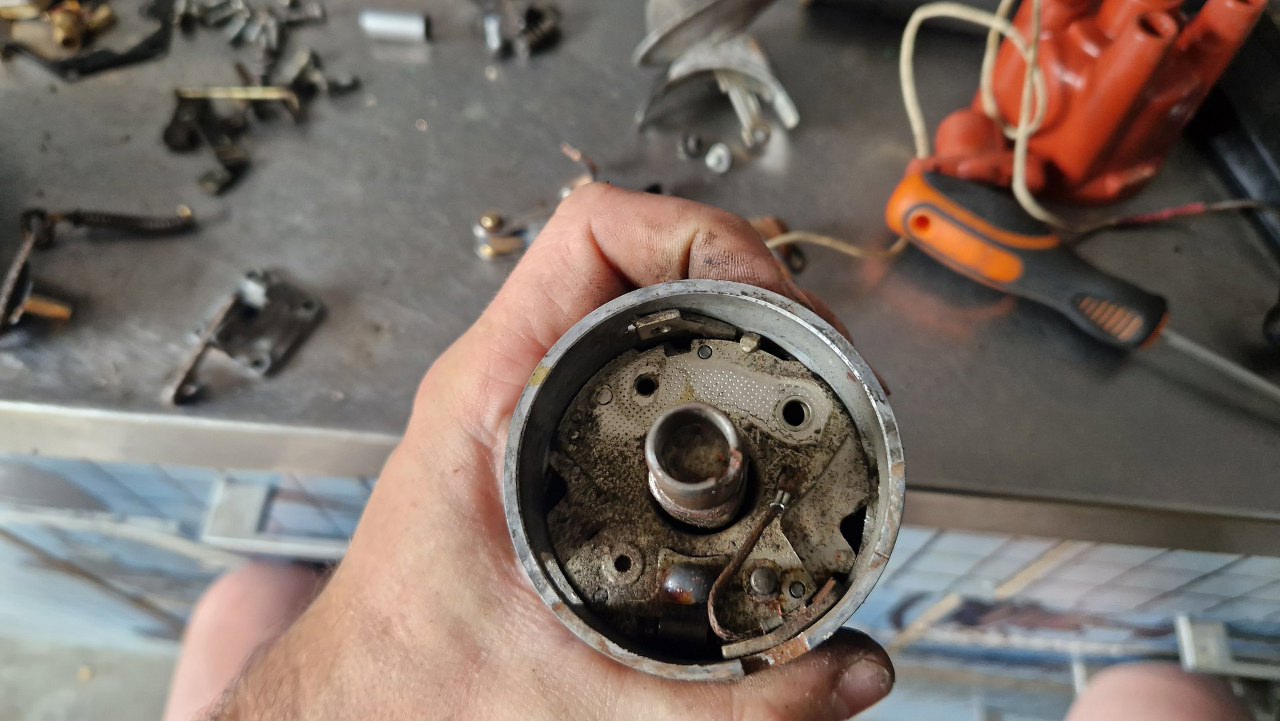 Po złożeniu reszty mechanizmu i wyregulowaniu styków przerywacza nasączyłem filc w środku ośki.
