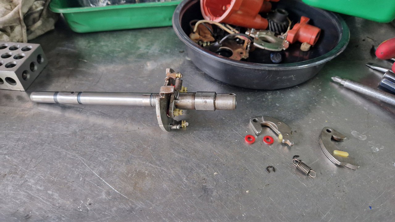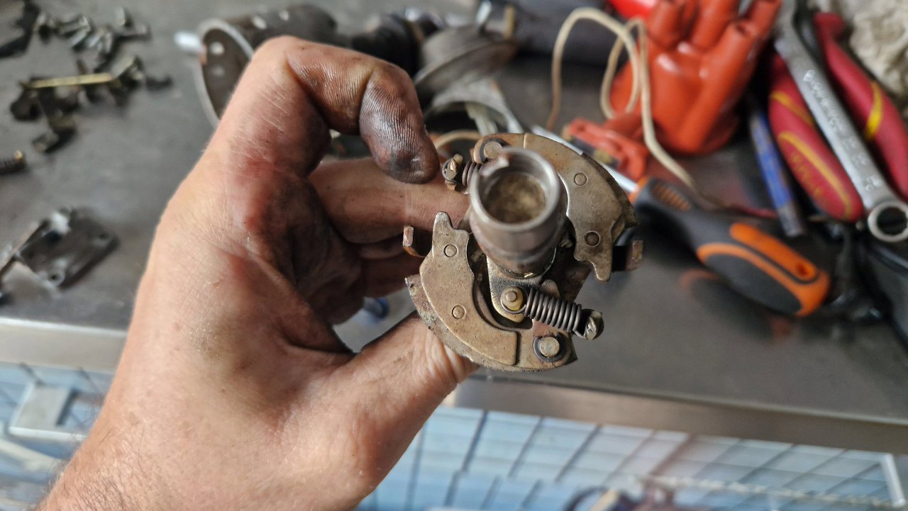 Po gaźniku składam aparat zapłonowy. Te wszystkie części też dokłądnie oczyściłem. Tu widać ciężarki i sprężynki mechanizmu odśrodkowego.
