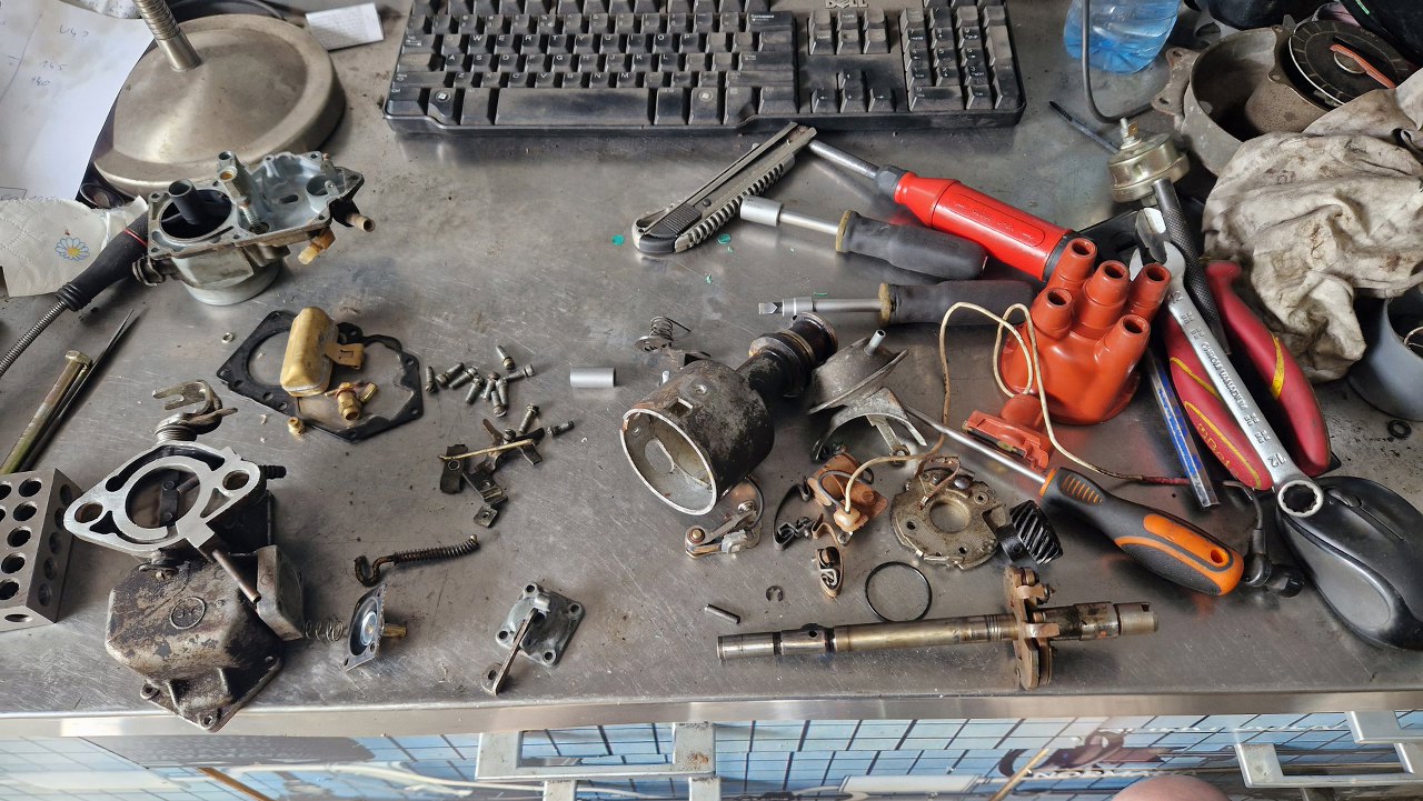 Gaźnik i aparat zapłonowy są rozłożone, a ja mam stos części na stole.