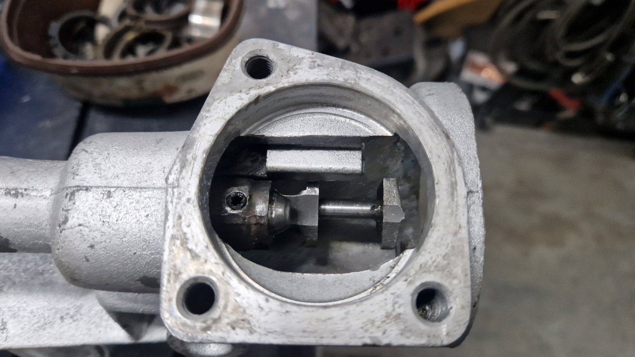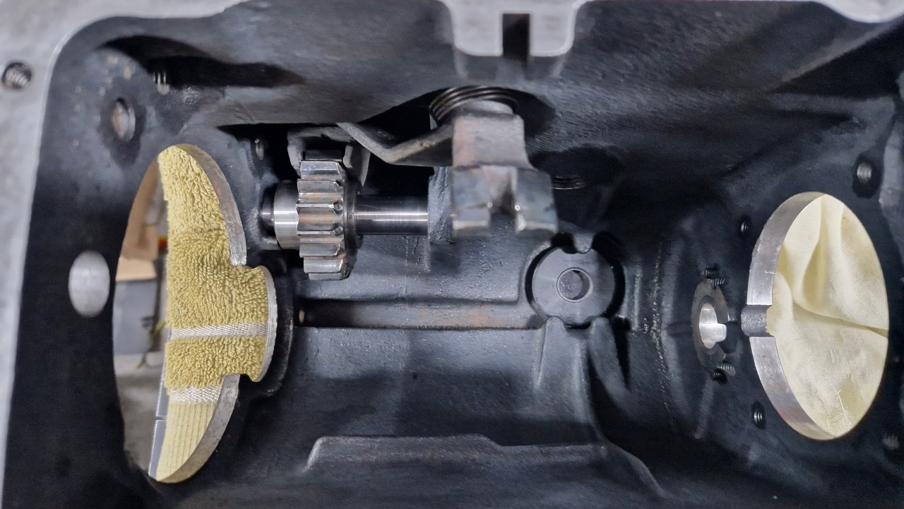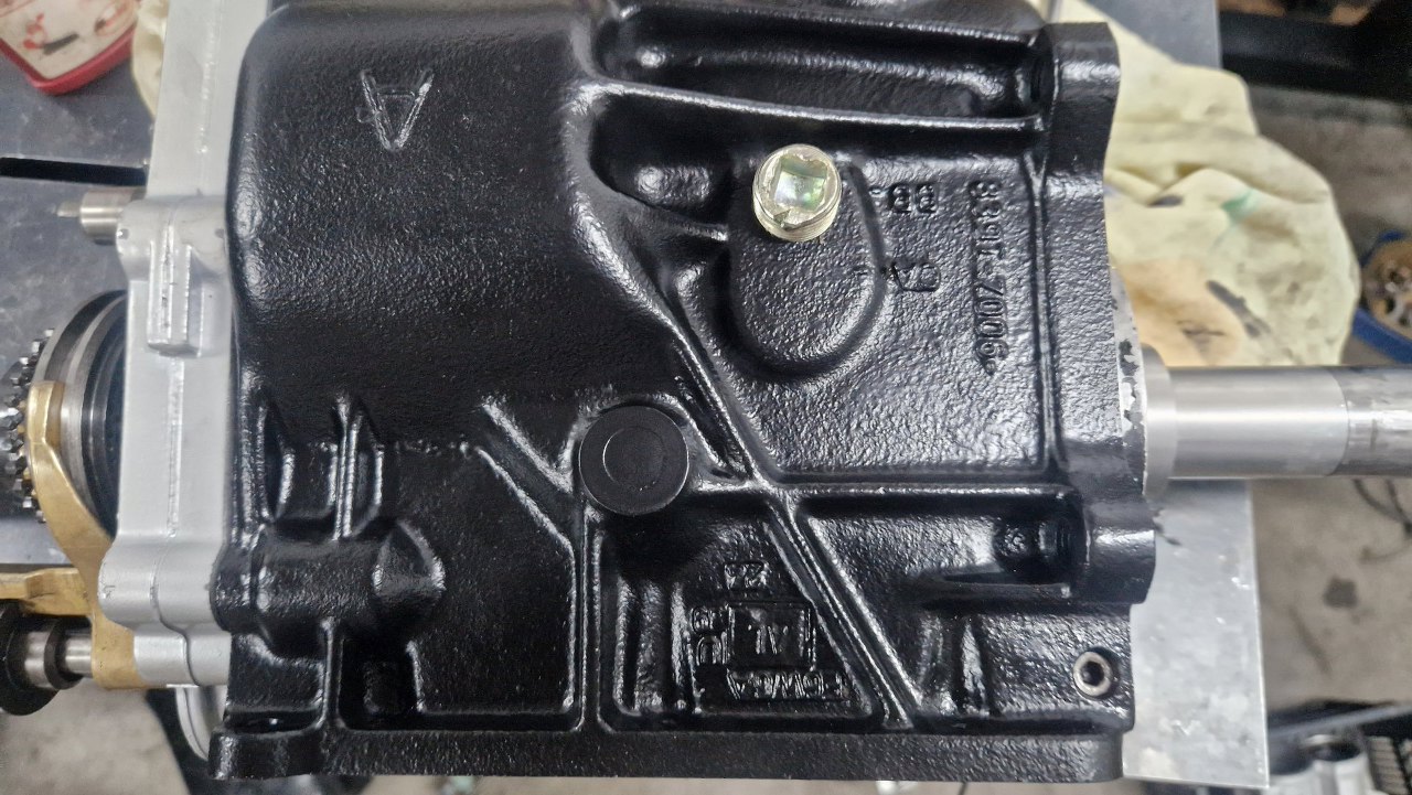 W obudowie po lewej widać wciśnięty wałek, na którym łożyskowany jest wałek pośredni. W tej skrzyni osłonięty jest tą okrągłą pokrywką.