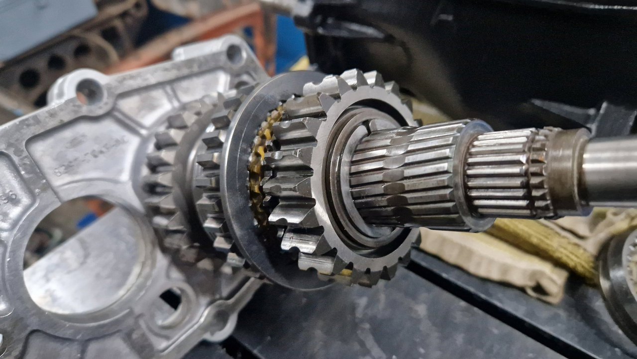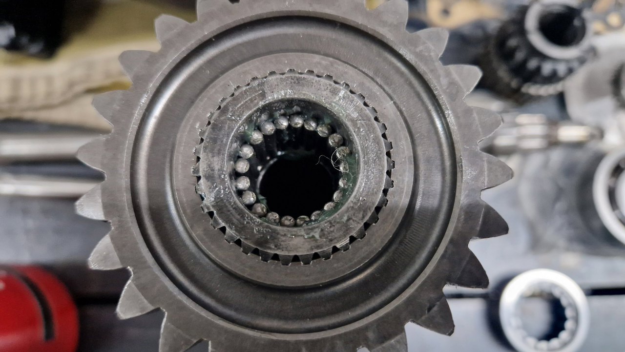 Pora na wałek wyjściowy. Składany jest podobnie, co standardowy, ale niektóre koła zębate nie ślizgają się bezpośrednio po wałku, a mają dodatkowe tuleje i łożyska igiełkowe - na przykład po lewej.