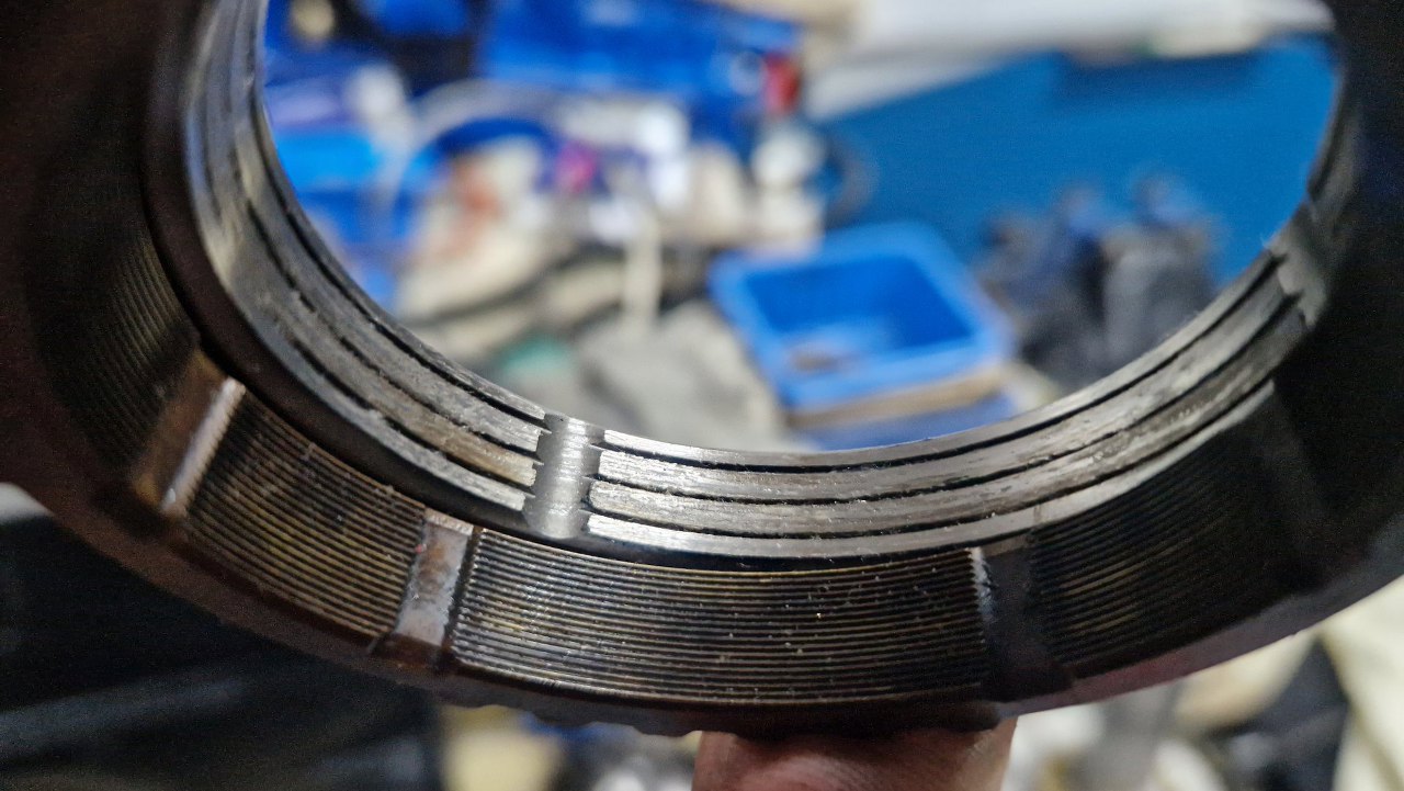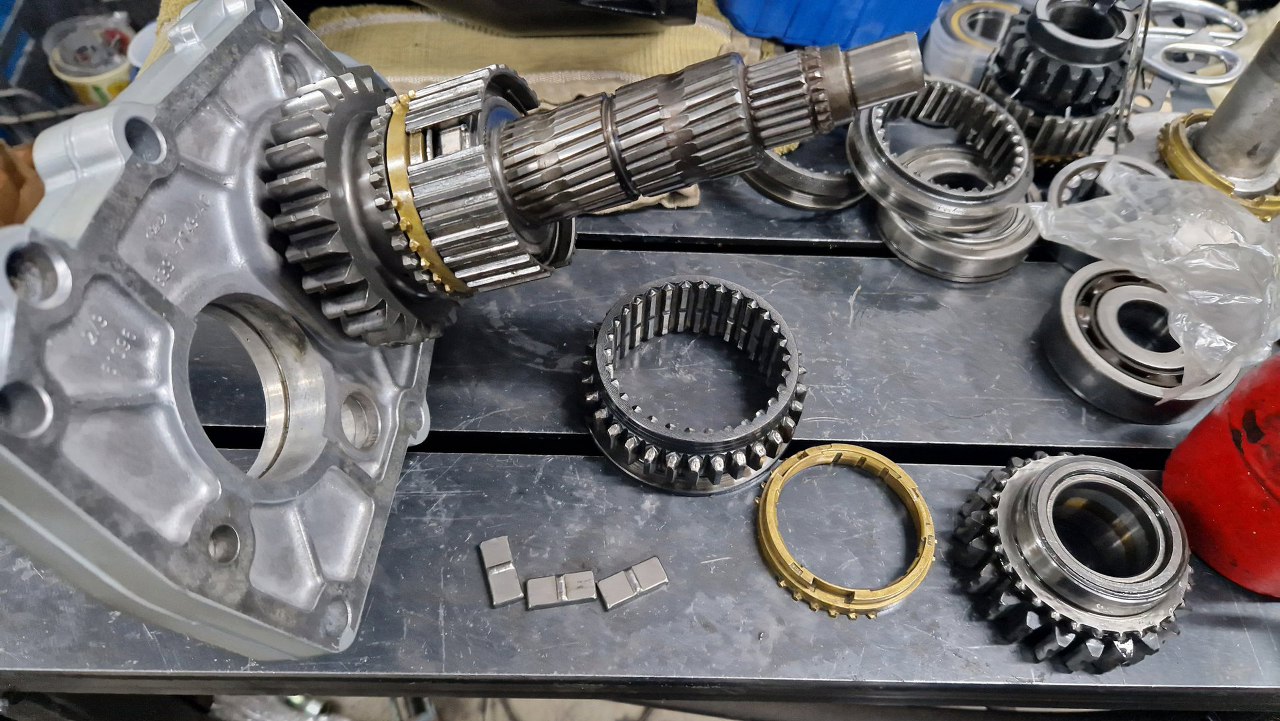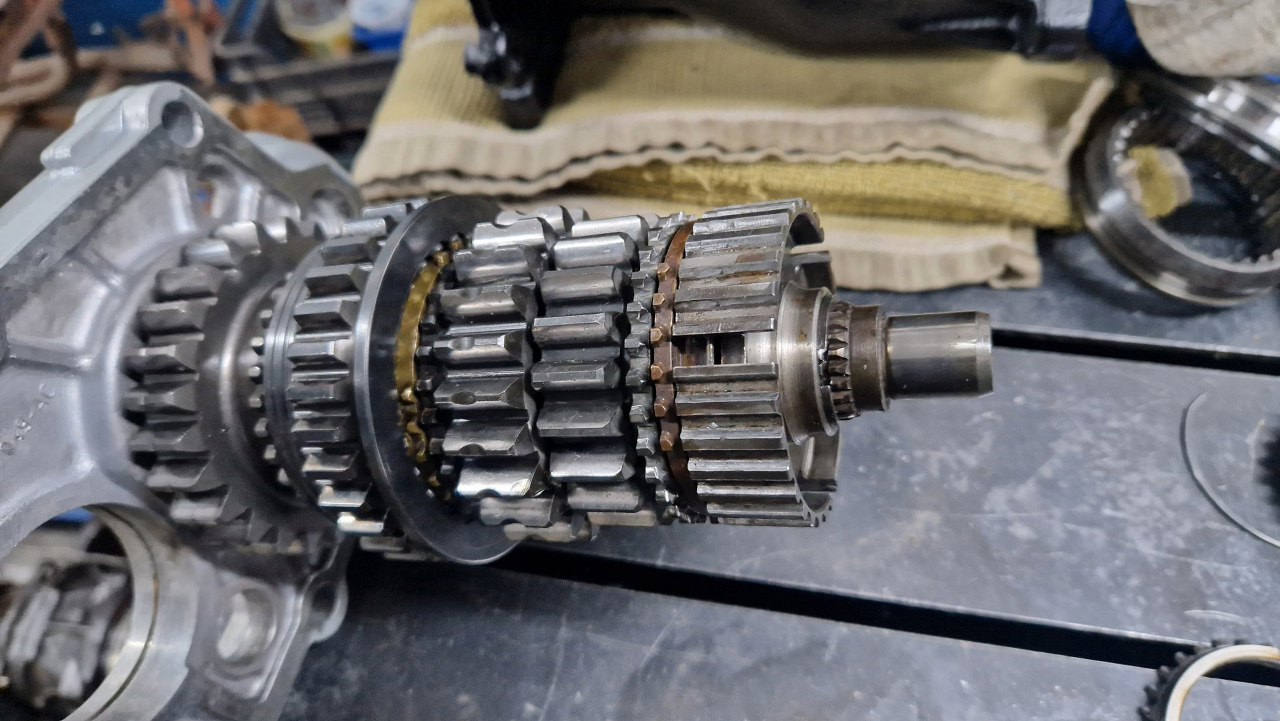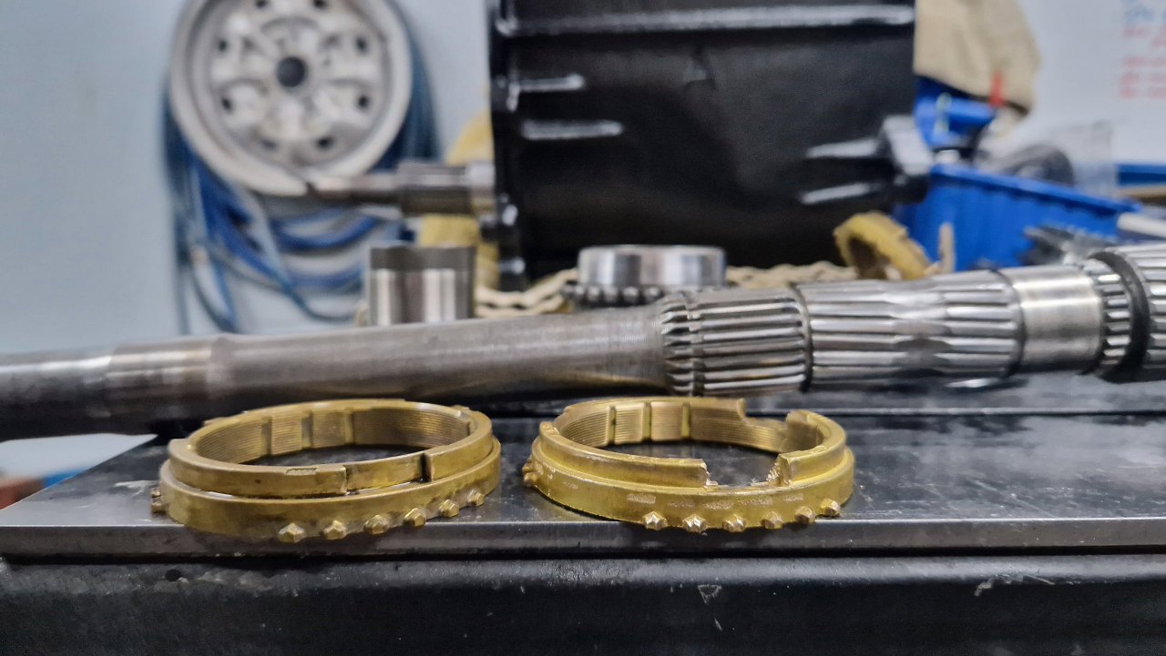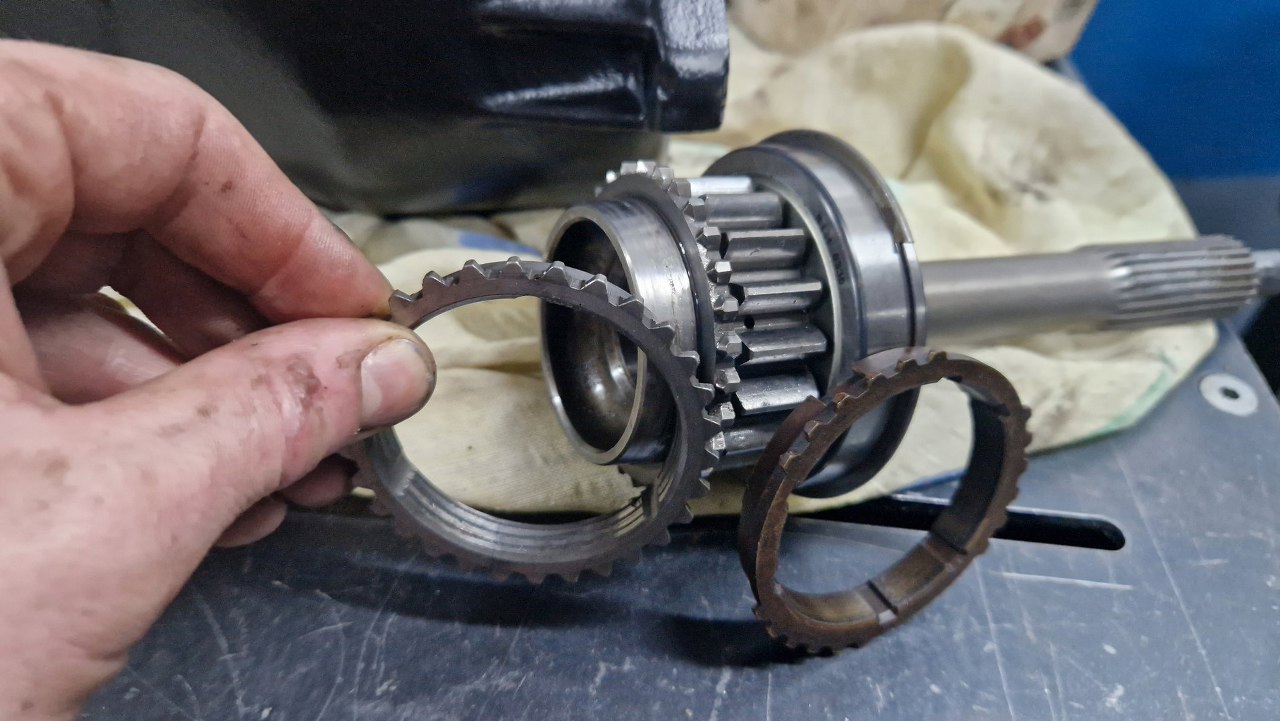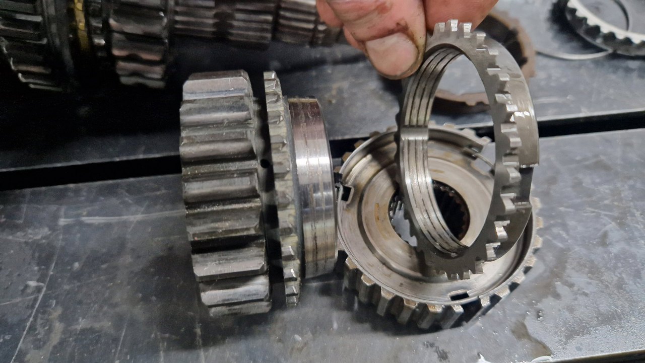 A tu natknąłem się na kolejne uszkodzenie. Synchronizator pierwszego biegu ma wyrwane kawłki metalu. Na szczęście mam zapas takich części i mogę go od razu zastąpić.