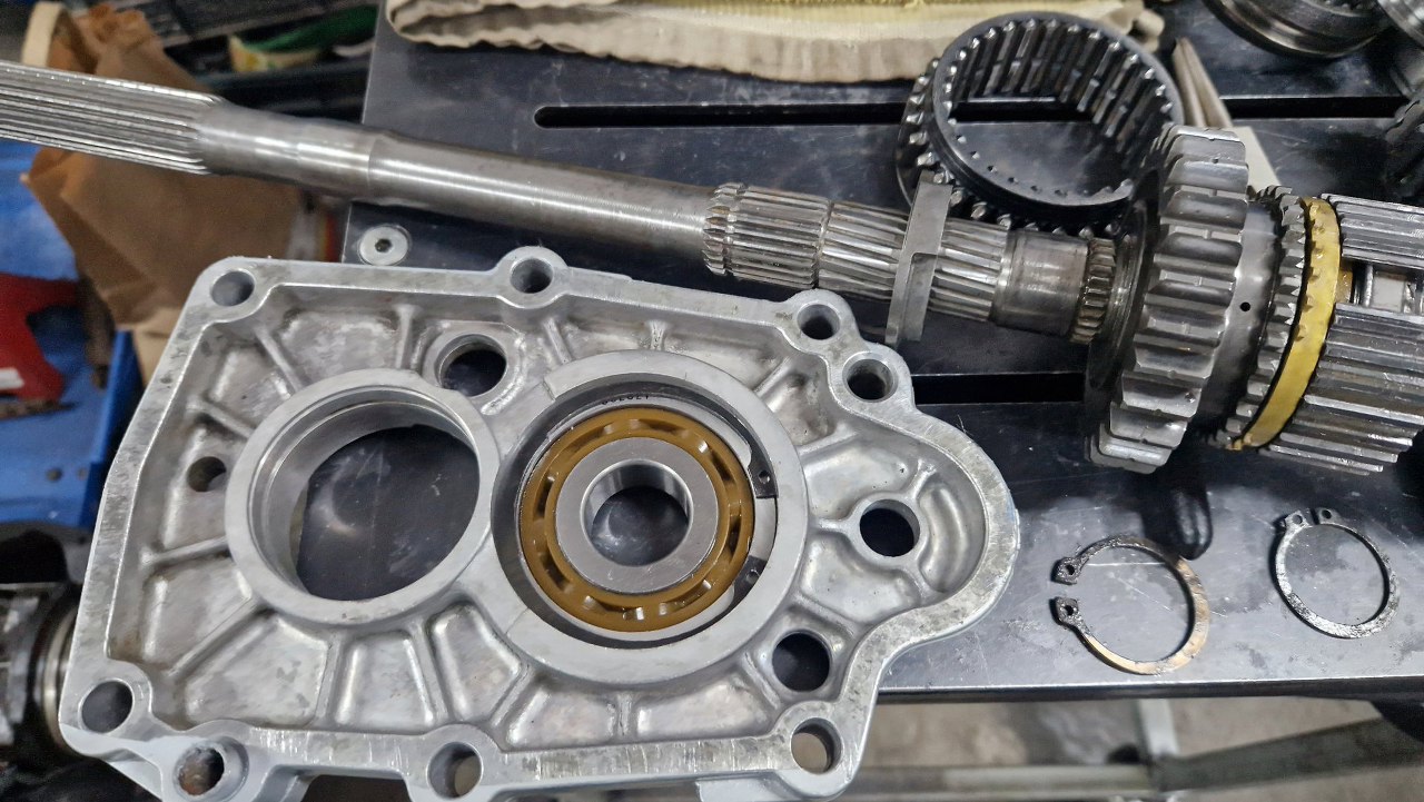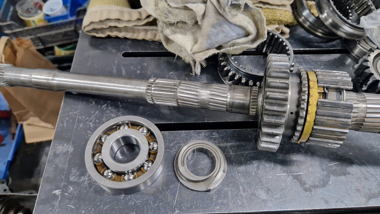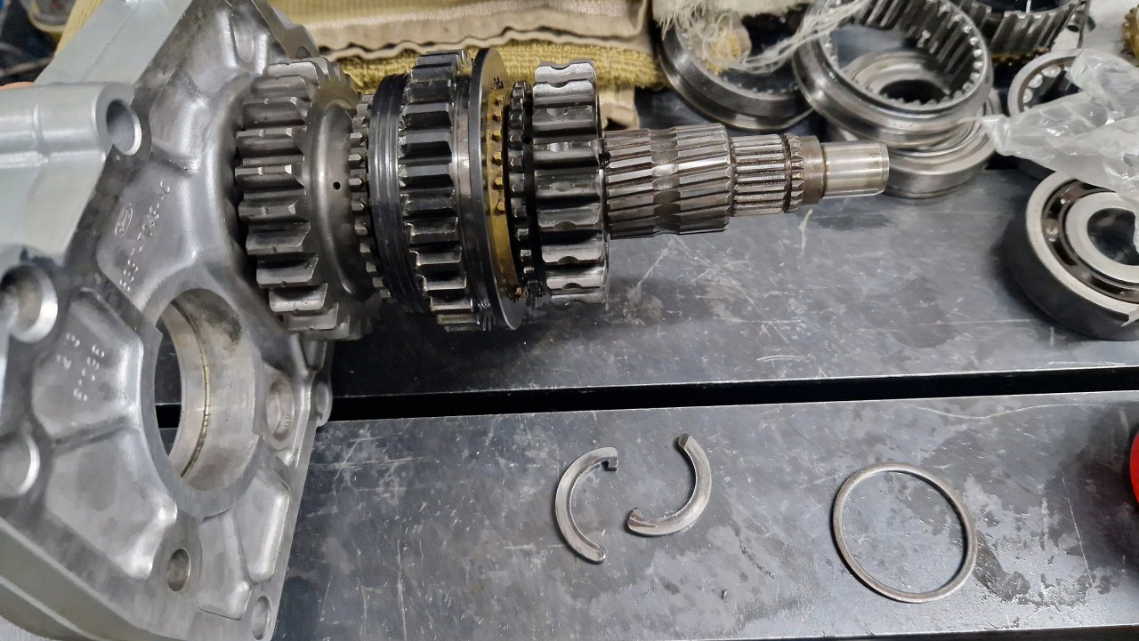 Wszystko to w odpowiedniej kolejności założyłem na wałki. Koło piątego biegu na wałku pomocniczym zazwyczaj jest mocno dokręcone nakrętką, ale nie tu - tu wystarcza kolejny pierścień sprężysty, bo koło nie ma skośnych zębów a proste - dlatego obciążenia wzdłużne są tu znikome.