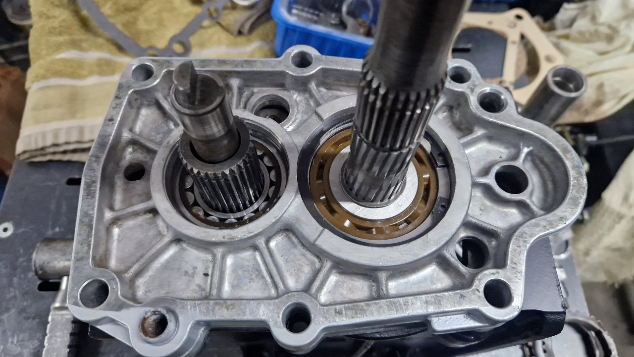 Ta część obudowy też jest inna. Stara miała ślady obrócenia w niej obu łożysk. One tam wchodzą dość luźno, ale nie powinny się obracać. Nie chciałem ryzykować, więc znalazłem u siebie taką część używaną. Tu łożysko wałka wyjściowego jest już zamontowane.