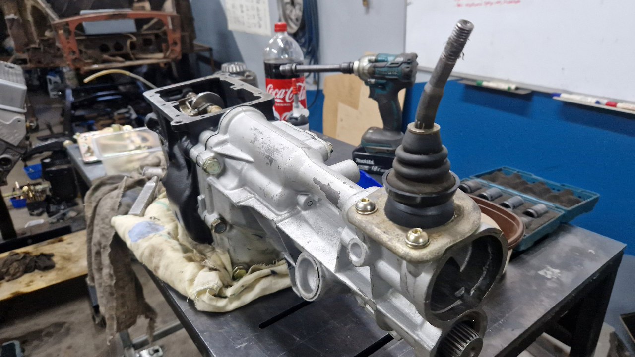 Potem założyłem ogon skrzyni. Po wrzuceniu wstecznego biegu jest dostęp do założenia tej części i zabezpieczenia jej kołkiem.