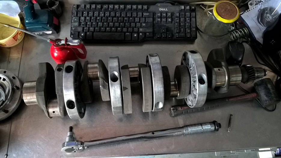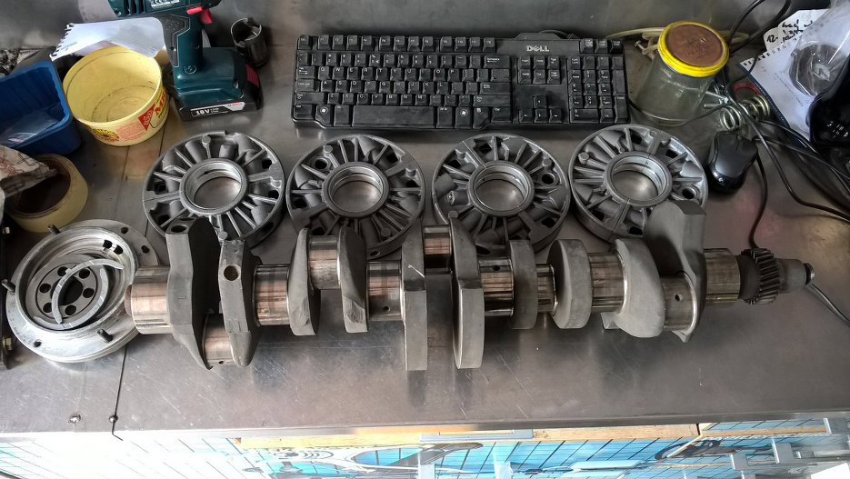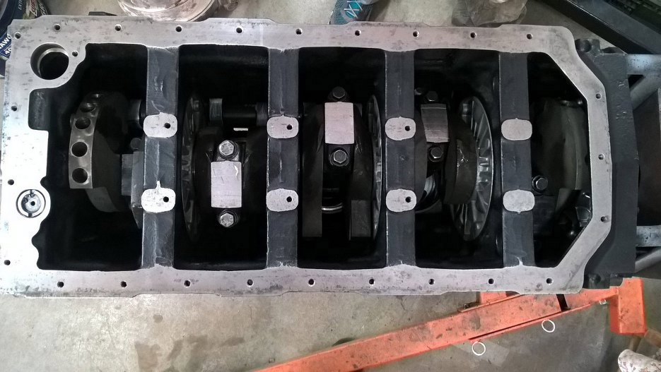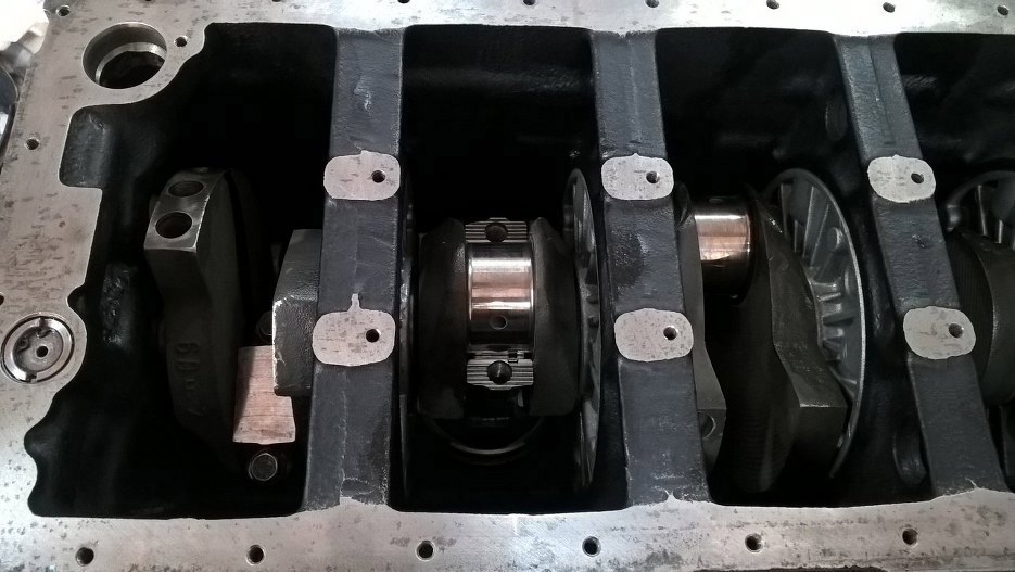 Wał został umieszczony w bloku. Ledwo widoczne śruby u dołu zdjęcia, wkręcone w blok, trzymają te okrągłe stopy wału, żeby się nie obracały. Dodatkowo, to one właśnie dostarczają olej do panewek głównych z magistrali olejowej.